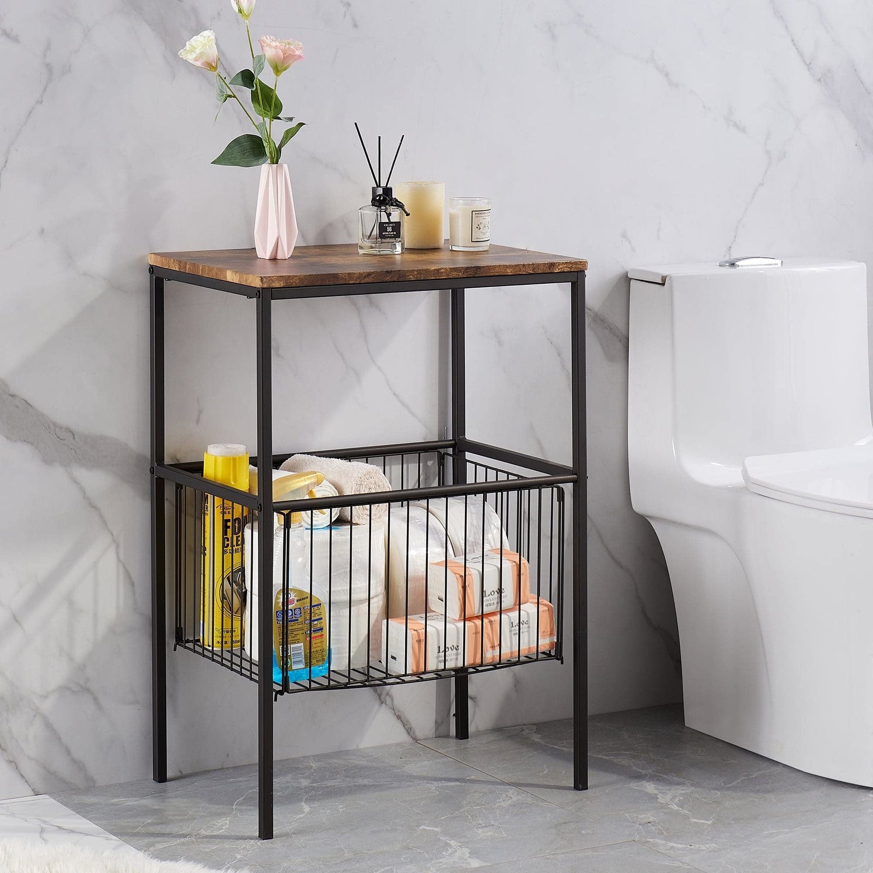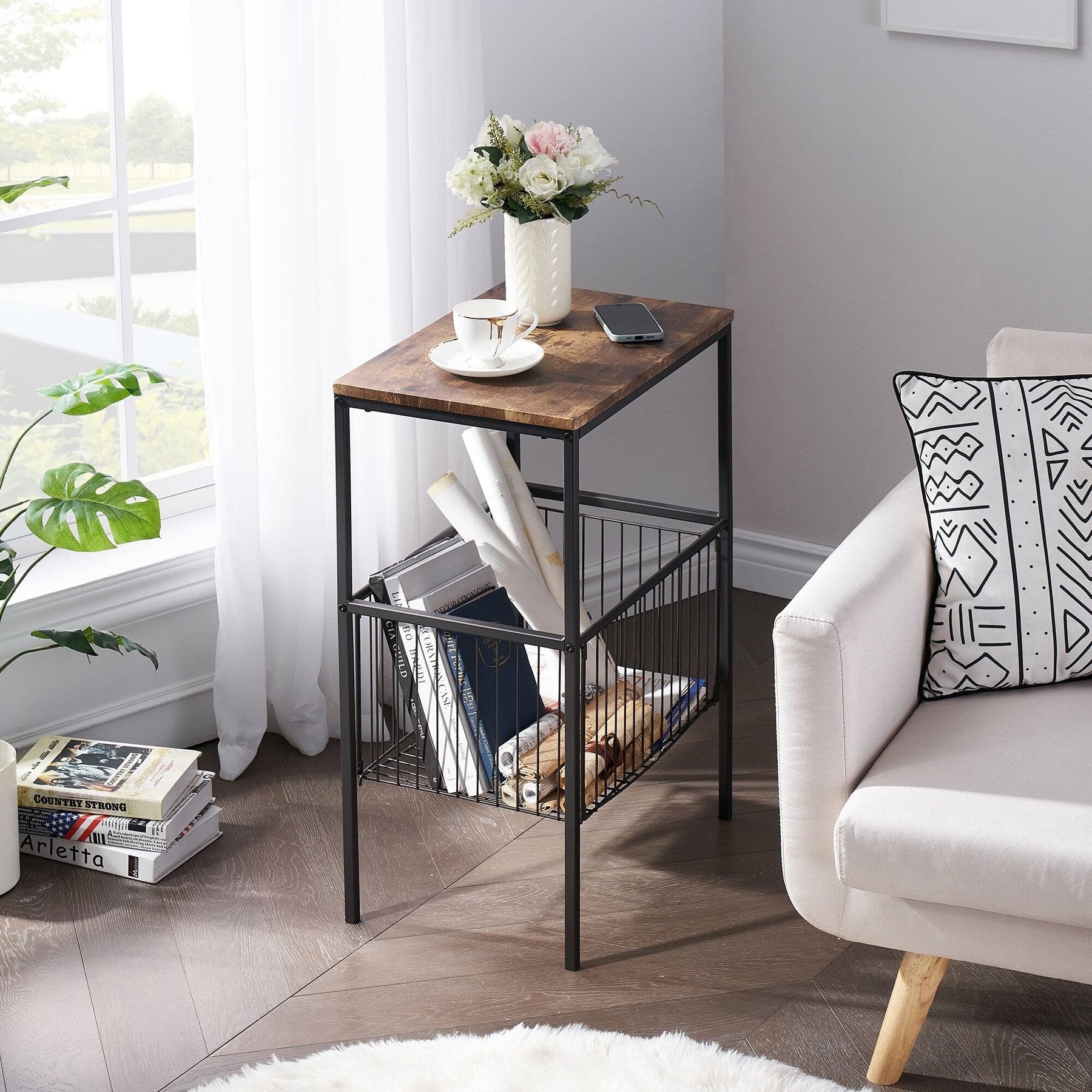31" Height Modern Side End Table With Storage Mesh Basket Brown Casual Contemporary Rectangular Mdf Wood Metal Finish Includes Hardware | Multi-Purpose Shelf Organizer: Versatile side table is perfectly used as s sofa side table, nightstand, coffee table, end table, telephone table, storage organizer, computer desk extensions or additions in the living room, lounge, office, laundry room, kitchen, bathroom ect. Quickly Assembly: We all the necessary hardware and tools, and an illustrated installation manual to help you set up this product. Design/Look : Casual, Modern & Contemporary. Material : MDF, Wood | Side Table with Storage Basket: 31 inch tall side table is designed of spacious desktop and one foldable metal basket. The basket height of 10.4" to ample room for organizing your books, magazine, kitchen and bathroom items. Worry-Free Service: If there are any problems with the product you received, to get free parts or a BRAND NEW item for replacement. Finish : Metal Finish, Wood Finish. Assembly : Assembly Required. Base type : 3 and 4 Legs.