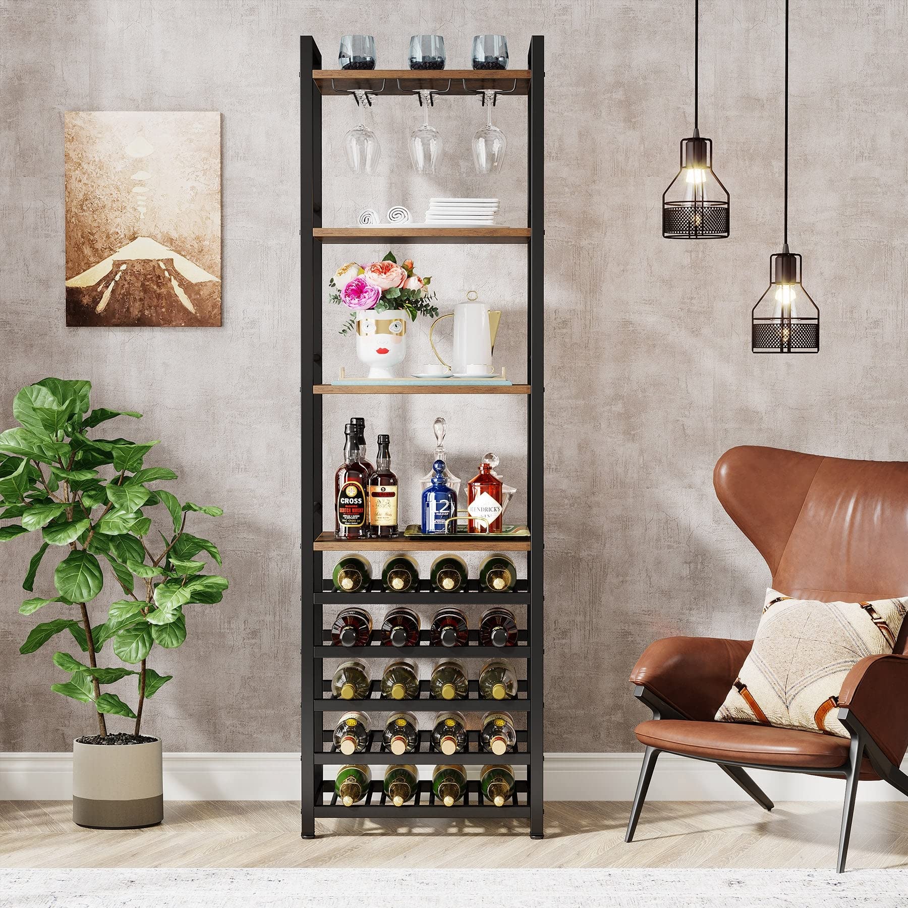 9-tier Freestanding Floor Wine Rack 20-bottle Bakers With Glass Holder And Storage Shelves Brown Industrial Metal Wood | Design/Look : Industrial. Material : Metal, Wood. Assembly : Assembly Required. Bottle count : 20. Color : Brown | Product Size: 17.72 In. W X 70.87 In. H X 13.78 In. D.