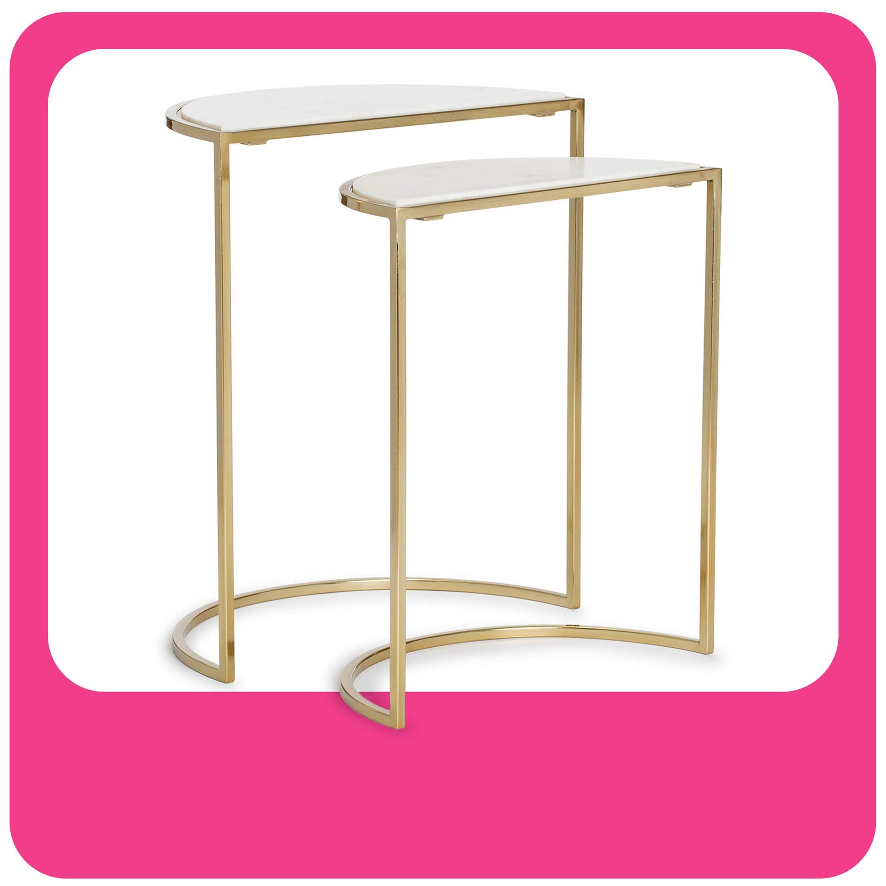 LUXURIOUS LOOKS: Marble table tops and gleaming golden metal frames are an elegant match. | SPACE-SAVING DESIGN: These two nested tables fit neatly together for easy storage in small living spaces. | COMPACT DIMENSIONS: The narrow design and small measurements make these side tables perfect for apartments and dorm rooms. | EASILY PORTABLE: Decorate and redecorate your living space as you please with these lightweight yet durable side tables. | SUITS ANY ROOM: Use these nesting tables to bring style and practicality to your bedroom, living room, or other spaces.