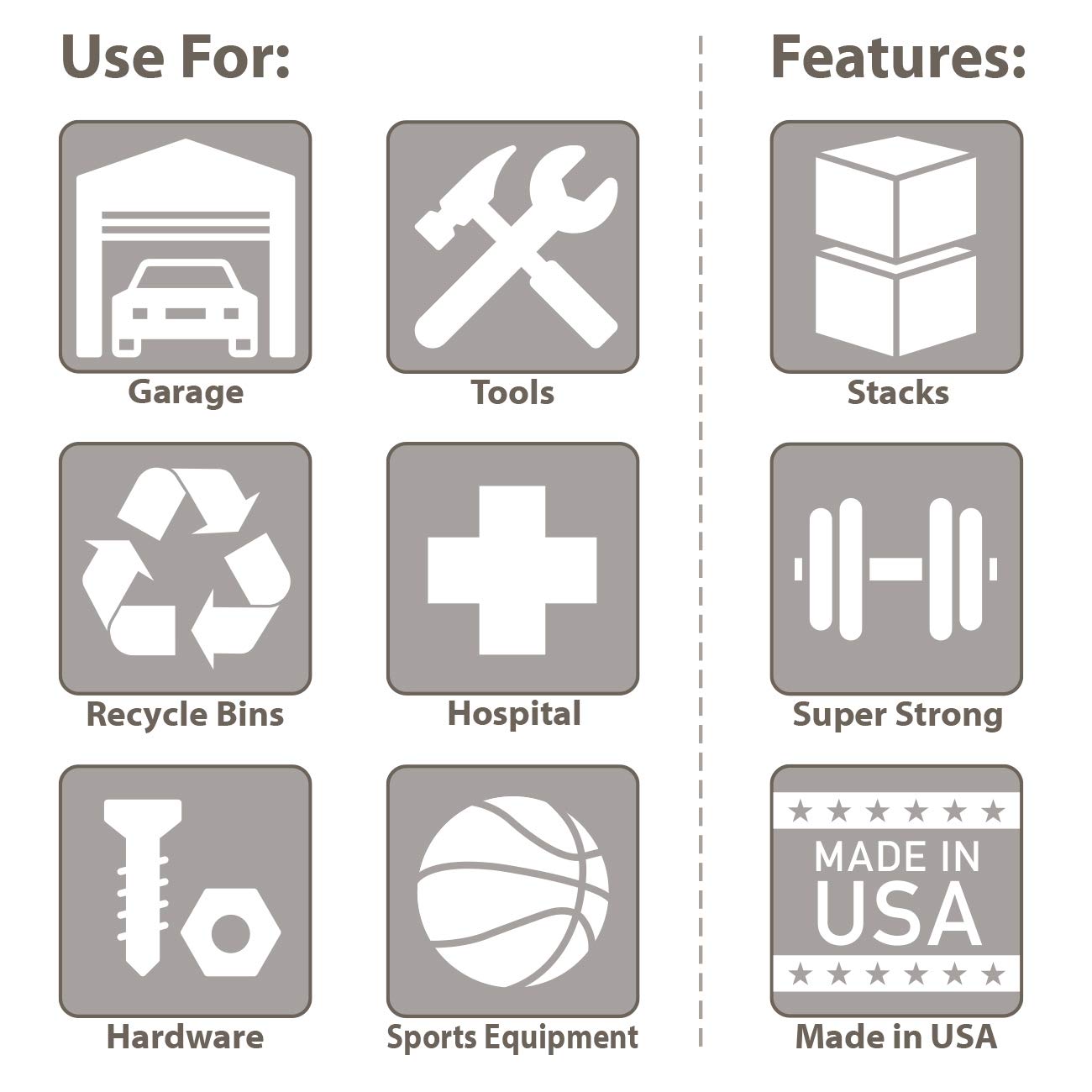 STORAGE BIN DIMENSIONS- Outside (23-7/8-Inch L x 16-1/2-Inch W x 11-Inch H), Inside (20-3/4-Inch x 14-3/8-Inch x 10-1/8-Inch) - Case of 1 | DURABLE- High quality, super strong, sturdy stacking bins made from industrial-grade plastic will withstand cold temperatures and won't flex even when full; 200 Lb. load capacity | GREAT FOR ORGANIZING- Garages, closets, warehouses, RVs, storerooms, heavy & bulky supplies, chest freezers, pantries, workshops, laundry areas, sheds, barns and more | EFFICIENT- Wide open hopper front provides easy access even when stacked; large comfortable handle on the back; bins stack securely, saving floor space; extra-large front area for labels (not included); dividers available (sold separately) | PROUDLY MADE IN THE USA