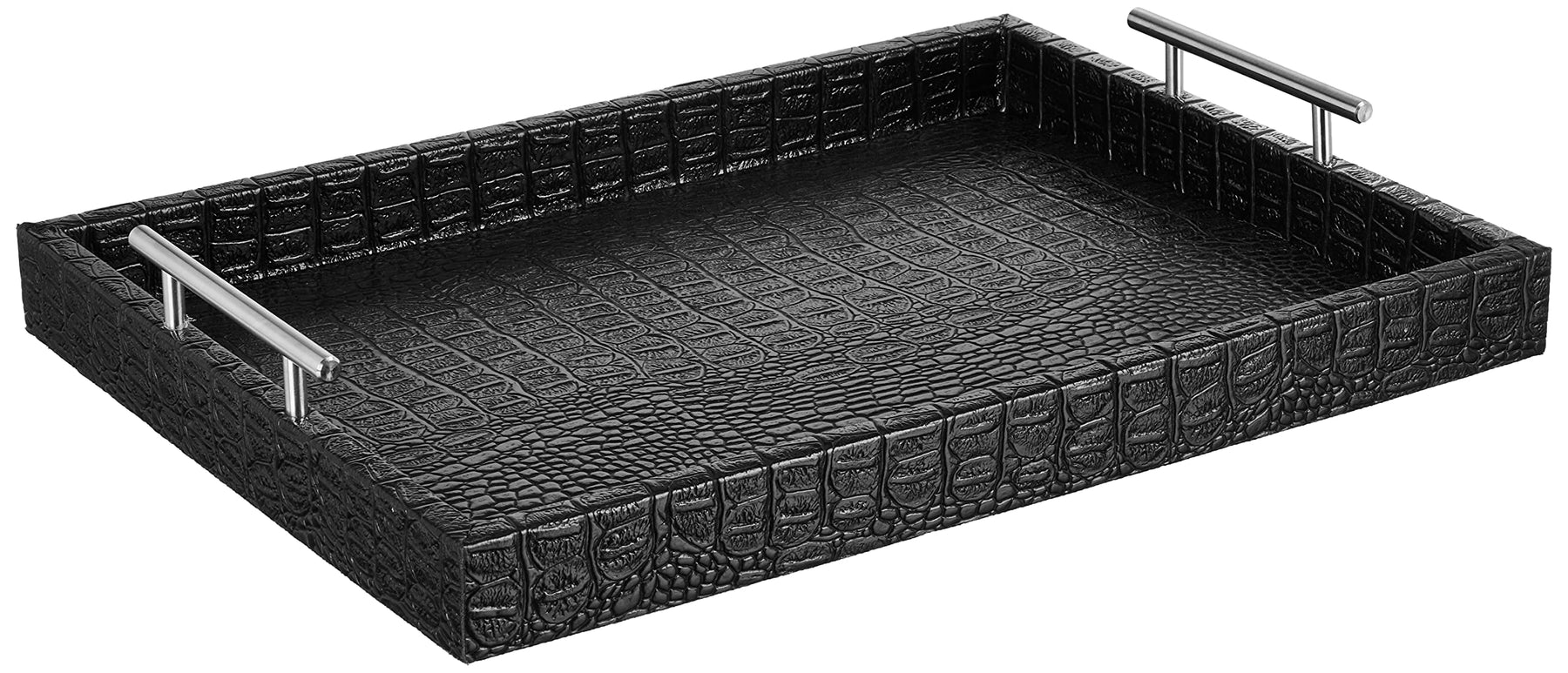 American Atelier Alligator Leather Serving Tray with Metal Handles Black