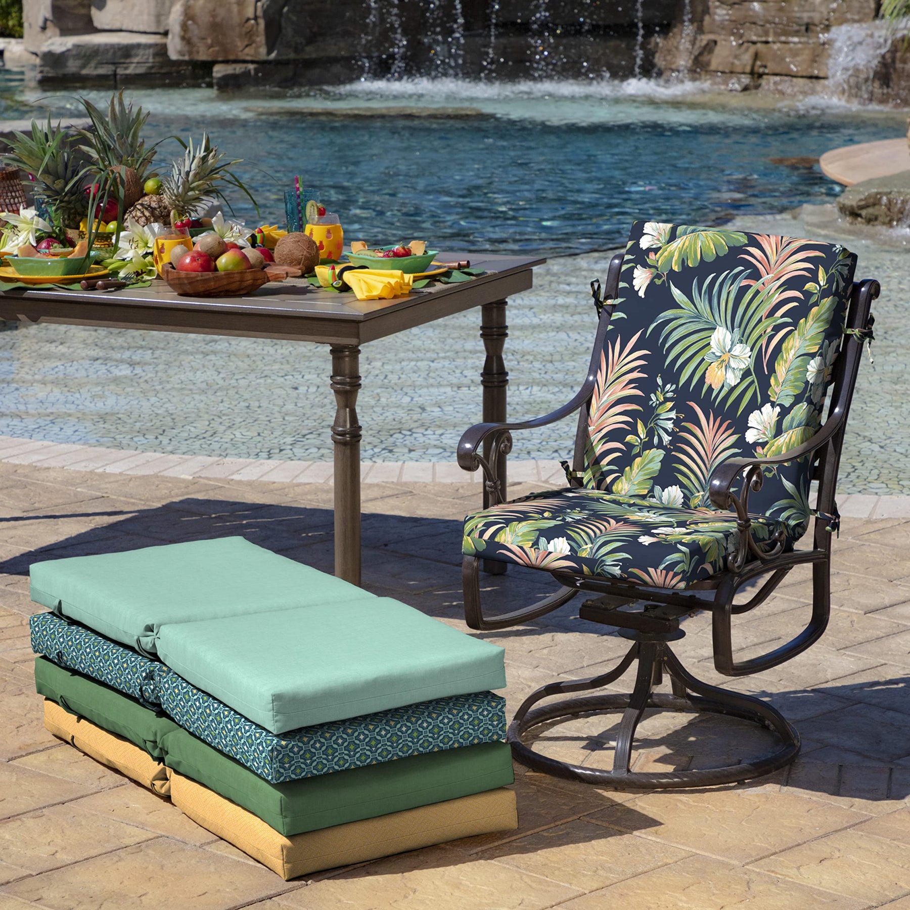 The Arden Selections Outdoor Highback Dining Chair Cushion is made with long-lasting outdoor polyester fabric with PFAS-Free C0 treatment and partially recycled polyester fill. Creating a comfortable cushion that is eco-friendly and Skin-safe for your family. This outdoor chair cushion measures 20 in W x 44 in H x 3.5 in T (seat cushion is 20 in W x 20 in L and seat back is 20 in W x 24 in L). The 100% printed polyester outdoor fabric resists fading, so your patio cushion looks vibrant for longer. Skin-safe C0 water protection helps your Dining Chair cushion withstand continued outdoor use, while easy cleaning with just soap and water for low-maintenance upkeep. Four sets of ties make sure your outdoor cushion stays firmly in place. Inside this outdoor chair cushion is partially recycled polyester fill helps it retain shape and provide long-lasting comfort during outdoor use. Although this Midback cushion is both water and UV-resistant, we recommend bringing it indoors when it rains or when not in use to preserve its lifespan and keep it looking beautiful.