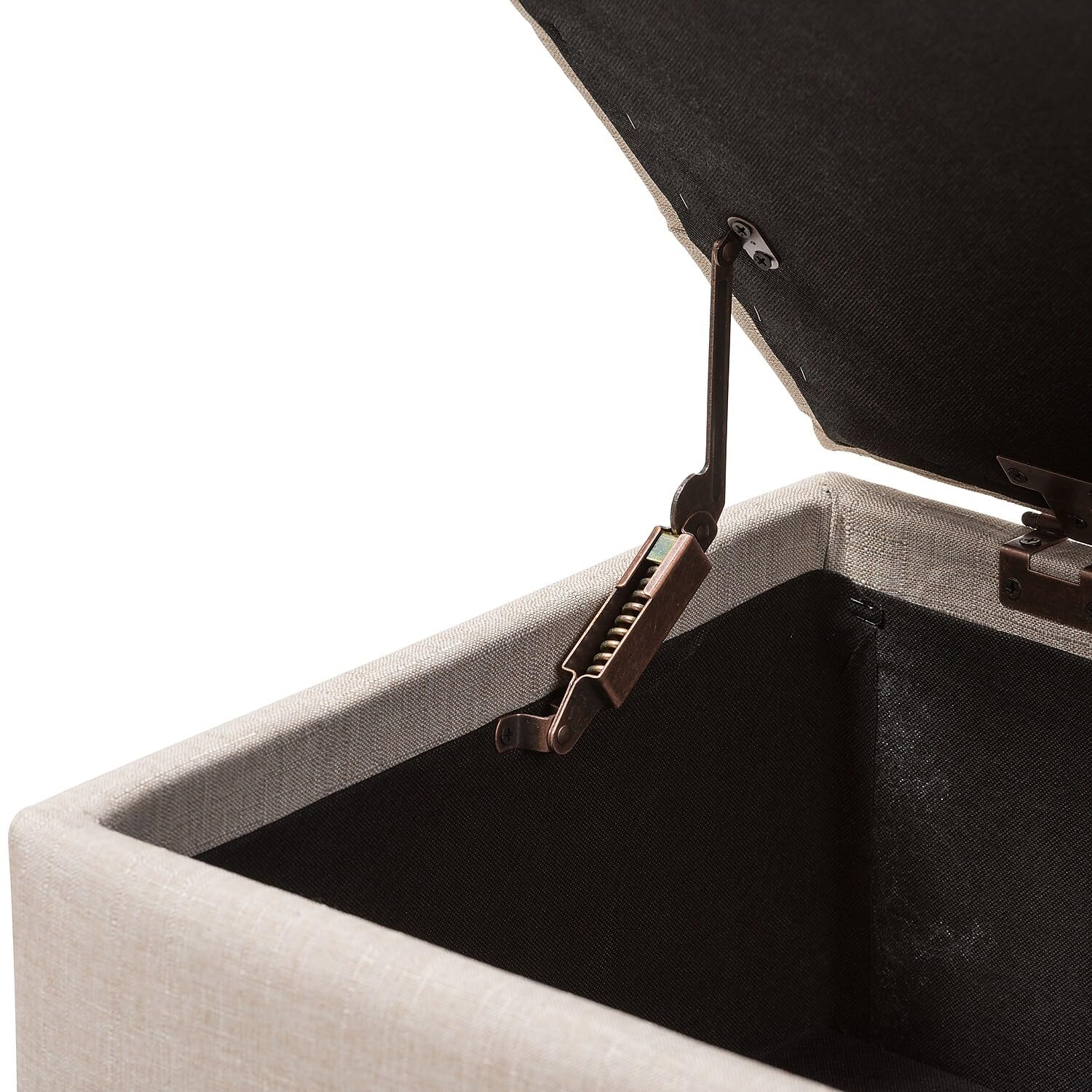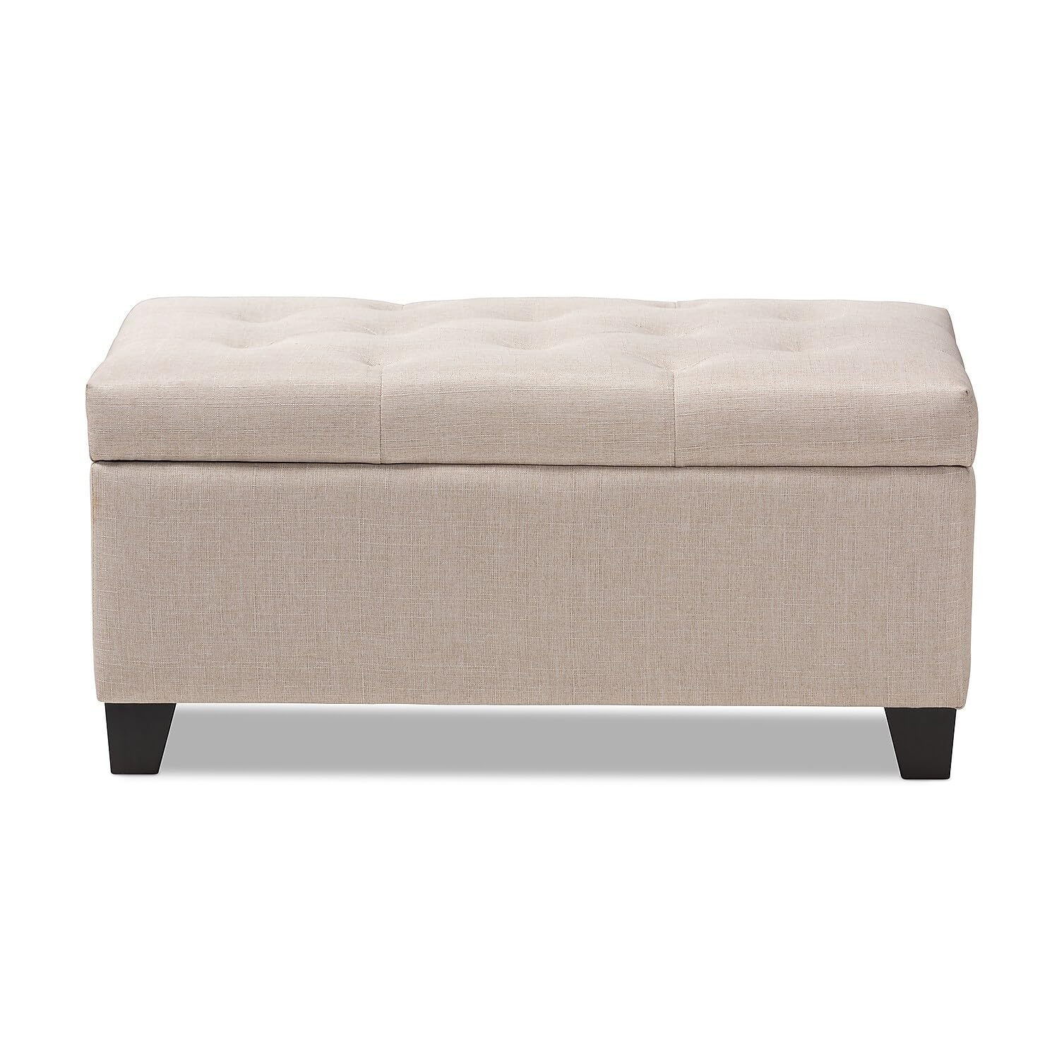 Cute, sturdy, and practical, the Michaela storage ottoman can meet a wide range of your organization needs. The modern and contemporary-inspired design emphasizes simplicity and neutral colors. The Michaela is upholstered in a pleasant beige fabric, with a foam-padded, button-tufted lid. The ottoman features a storage compartment under the lid, made secure with a spring hinge. The Michaela has black finished wood feet, and can fit easily in many areas. Use this storage ottoman at the edge of a bed, as storage in the guest room, a place for shoes or toys in your entryway - wherever needs to be more tidy! Made in China, the Michaela requires minimal assembly - all you need to do is attach the feet.Features Modern and contemporary storage ottomanBeige fabric upholsteryFoam-padded, button-tufted topConcealed storage compartmentSpring hinged lidAssembly requiredMade in ChinaDimensions: 16.93" High x 35.83" Wide x 17.72" Deep; Seating Dimensions: 16.93" High (from Floor) x 35.83" Wide x 17.72" Deep; Storage: 8" High x 33" Wide x 16" Deep; Legs: 3.15" HighSET INCLUDES: One (1) Storage OttomanSTYLE: ContemporaryMATERIAL: Fabric Linen "Polyester 100%"/Chinese Wood/Plastic/FoamCOLOR: Beige