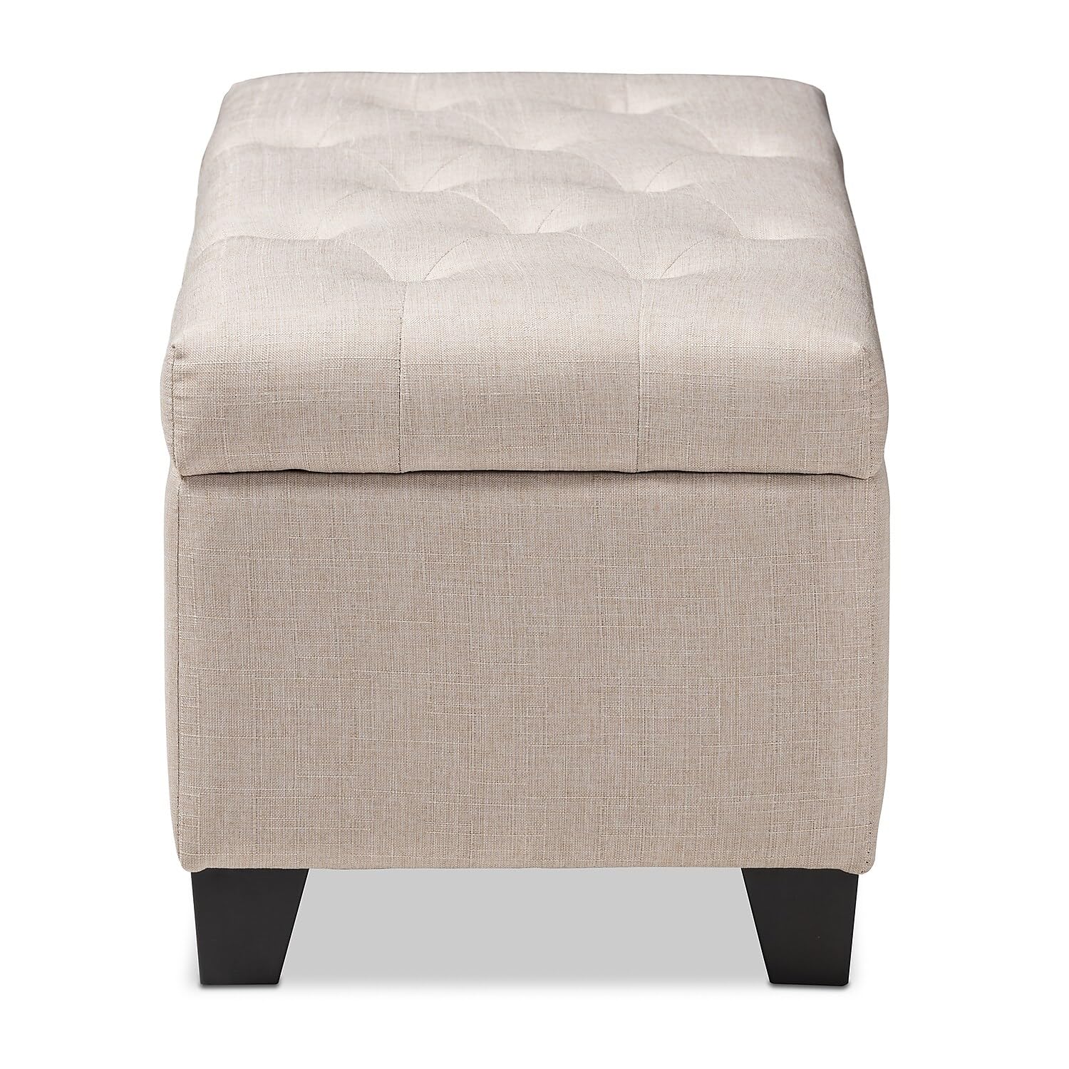 Cute, sturdy, and practical, the Michaela storage ottoman can meet a wide range of your organization needs. The modern and contemporary-inspired design emphasizes simplicity and neutral colors. The Michaela is upholstered in a pleasant beige fabric, with a foam-padded, button-tufted lid. The ottoman features a storage compartment under the lid, made secure with a spring hinge. The Michaela has black finished wood feet, and can fit easily in many areas | Beige fabric upholstery | Foam-padded, button-tufted top | Concealed storage compartment | Spring hinged lid
