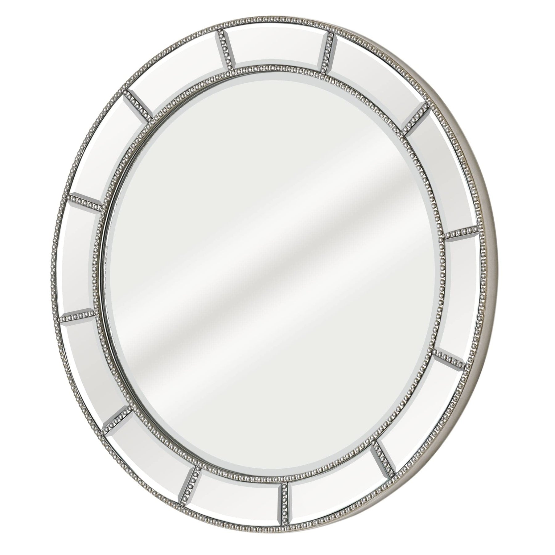 Beaded Champagne Silver Beveled Round Wall Mirror 30 X Modern Contemporary Glass | ROUND BEADED FRAMED MIRROR - Discover how a round mirror featuring a shimmery silver beaded frame provides a unique elegance to almost any home decor style. MODERN DESIGN - Decorate your space with a modern designed mirror that emphasizes sleek craftsmanship in beveled edges, beaded framing, and inlaid mirror details. BEVELED-EDGE MIRROR - Beveled edge mirrors, usually heavier in weight, add sophisticated elegance to a space by exhibiting a rainbow effect reflection when capturing light | Product Size: 30.0 In. L X 1.5 In. W X 30.0 In. H. VERSATILE- Find versatility in room and decor style with this beautiful, luxurious beaded circle mirror in silver. EASY TO HANG- Two carefully placed D-rings on the back of our round beaded mirror make hanging an enjoyable, straightforward task. Design/Look : Modern & Contemporary. Frame color : Silver. Mirror shape : Round. Frame material : Glass. Color : Silver. Frame finish : Champagne Finish. Mirror size : Medium (15''-32'' high).