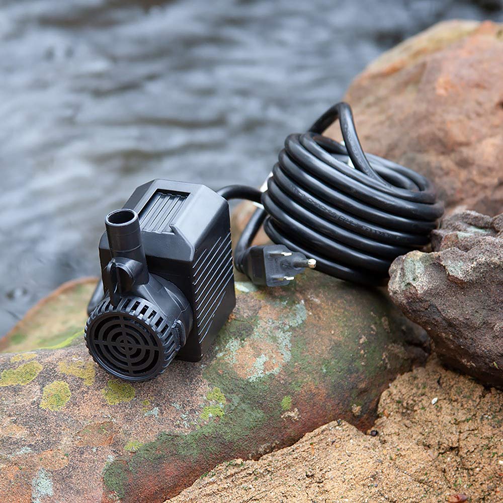 SUBMERSIBLE FOUNTAIN PUMP: Enhance your water feature with this device. Pumps oxygen into water, creating a healthy environment for plants and fish. Designed for most indoor and outdoor fountains, fish tanks, hydroponics, aquaponics, ponds, statuary, aquariums, and water gardens. Oil free and safe for fish and plants. | SPECS & DIMENSIONS: This pump measures 3.5 in. L x 2 in. W x 3.6 in. H and is equipped with a long 16 ft. cord for easy installation. Maximum flow rate: 290 gallons per hour; Maximum lift height: 6.5 ft.; Wattage: 20W; Voltage: 120V. Compatible with 1/2 in. or 5/8 in. ID tubing; adapters included. Adjustable knob so you can control the water flow and pressure. Ideal for 3 ft. to 5 ft. medium sized fountains or small ponds up to 580 gallons. | LOW MAINTENANCE: Clean your pump for optimal performance. Unplug the pump before handling and remove the intake screen and impeller by disconnecting them from the pump. Remove any residue using a stream of water, small brush or cloth, then rinse clean. | EASY TO OPERATE: Submerge the pump entirely underwater, and plug the cord into the nearest GFCI outlet. Always disconnect the cord from the electrical outlet before handling and repositioning your pump. To preserve the life of your pump, it should be completely submerged under water at all times when in use, and not run dry. | INCLUDED: Pump with 16 ft. power cord and adapter. UL Listed for electrical safety. 1-year limited manufacturer's warranty. | Packaging May Vary