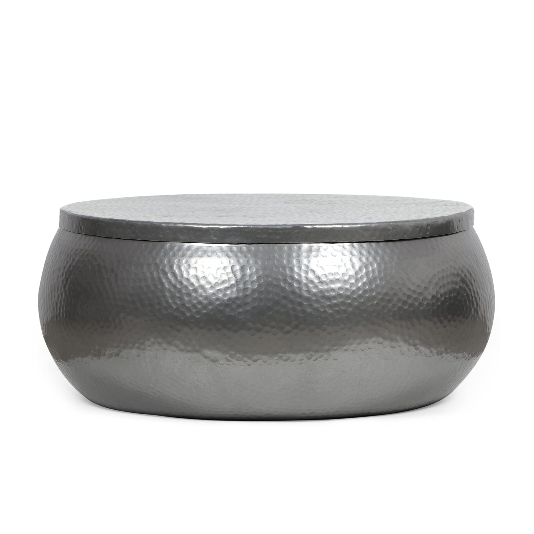MODERN: Our table offers a simplistic structure and metallic colors for a modern touch in any home. Featuring a charming drum shape and a beautiful hammered texture, this coffee table will instantly give your decor a chic atmosphere. | HANDCRAFTED DESIGN: This accessory is expertly designed and handcrafted with artisan expertise. Any natural variations are not product flaws, but rather, will ensure that your purchase is truly a one-of-a-kind product. | HAMMERED METAL: This coffee table features a hammered surface to create a gorgeous textured look. This finish allows this piece aesthetic versatility, blending seamlessly with a range of decor styles. | ALUMINUM FRAME: This coffee table is built with aluminum, creating a lightweight and stable frame. This material is rust-resistant which will further extend the life of your product. | DIMENSIONS: Choose an accessory that is the perfect size for you and your furniture. This coffee table is 29.00" W x 29.00" D x 12.00" H. You will love how much your space can transform with the simple addition of this charming table.