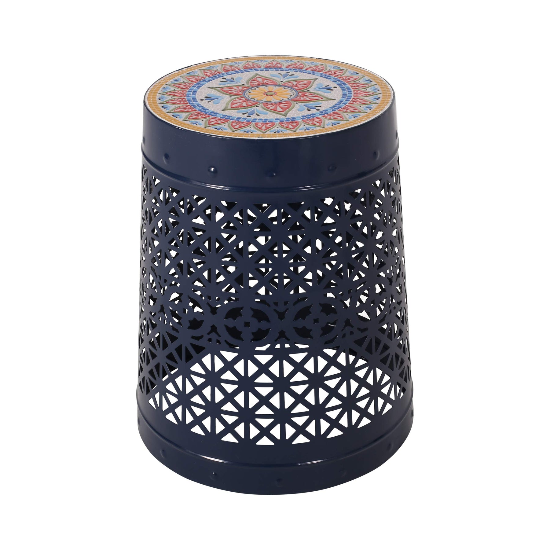 Combine function and charming style to create near perfection for your interior space. With a charming cylindrical structure and lace cut design, this end table is an excellent sidekick to your furniture, perfect for holding a tray of snacks or a pitcher of lemonade. This features a gorgeous tile mosaic tabletop that brilliantly blends a traditional touch with a sleek modern look. Also providing incredible stability, our accent table will have no problem keeping your home in style all summer long. Includes: One (1) Table Top Material: Tile Frame Material: Iron Top Finish: Multi-Color Frame Finish: Dark Blue Hand-Crafted Details Assembly Required Dimensions: 15.00 inches deep x 15.00 inches wide x 18.25 inches high