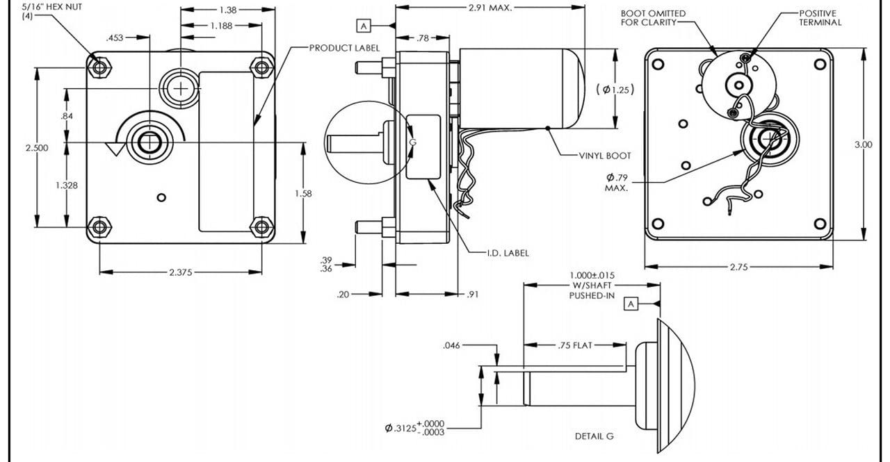 1/125 hp, 12 RPM, 1.30 amps, 12 Volts DC | 41 Torque inch pounds; Sleeve bearings | Shaft 5/16" x 1; with flat; Rotation = Reversible | Over Hung Pounds = 30 | One Year Manufacture Warranty