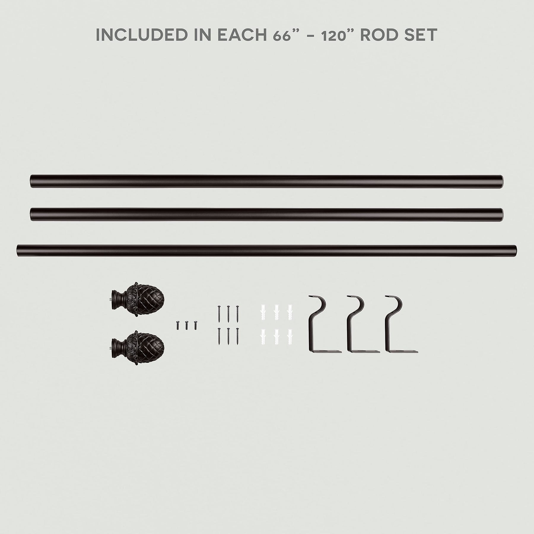 CLASSIC LOOK: The Exclusive Home Acorn curtain rod and finial set features a classic look and traditional design with acorn carved-look finials that offer an eye-catching decorative touch. | INCLUDED IN THIS SET: one (1) adjustable rod in three pieces, two (2) finials, three (3) fixed 3.5” depth projection brackets and installation hardware with instructions. | ADJUSTABLE DESIGN: This curtain rod is adjustable in length and extends from 66 to 120 inches. It will accommodate a wide range of window widths and types. | ACORN FINIALS: Includes two (2) 2.6" diameter carved resin finials in an acorn shape for a unique and stylish decorative finish for your window decor. | DURABLE ROD: The sturdy, iron rod measures 1" diameter and can be used to hang various fabrics and curtain panels including grommet top curtain panels, drapes with rod pockets and back tabs, capable of supporting heavier fabrics up to 25 lbs.