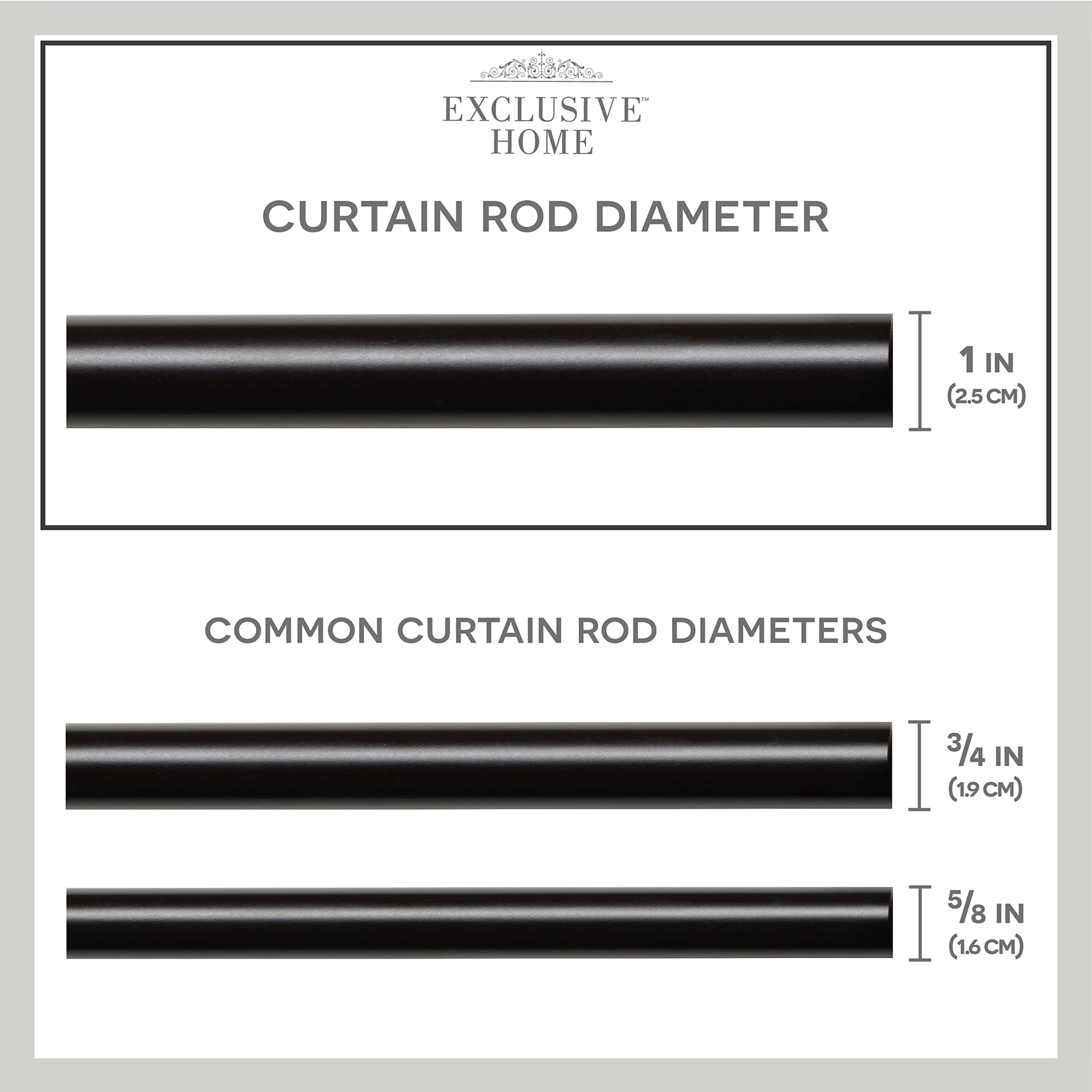 Description:Product DescriptionThe Exclusive Home Acorn curtain rod and finial set features a traditional design with acorn carved-look finials in resin and a sturdy iron curtain rod. The curtain rod has an adjustable design and measures 1" in diameter. It can be used to hang various fabrics and curtain panels including grommet top curtain panels, drapes with rod pockets and back tabs, and is capable of supporting heavier fabrics up to 25 lbs.From the ManufacturerExclusive Home is North America's leading supplier of home textiles, ready-made drapery, and window curtain hardware. We provide superbly crafted products that are affordable, yet luxurious, and are unsurpassed in quality and construction. Our window treatments are designed with timeless beauty in mind. We deliver high fashion designs and patterns, varying textures and fabrics, as well as a myriad of colors that today's discerning consumers expects. Exclusive Home window treatments are available in an array of fabric constructions including jacquard, linen, burlap, sheer, thermal/blackout, silk, faux silk, polyester, poly blends, cotton, and cotton blends. These fabric constructions are offered in varying designs and colors including classic solids, prints, textures, thickness, lengths, widths, and burnouts. Our window hardware is designed for that perfect finishing touch. You will find our window decor designs to be contemporary styles blended with timeless beauty to add a sophisticated feel to any room. Constructed from durable iron metal with various color finishes, our window hardware is sure to last a lifetime. From classic to contemporary designs and today's top fashion trends, you are sure to find that Exclusive Home textiles, drapery and window hardware will fit any look, mood, or style. Like millions of customers already have, let our designs be the anchor for each room in your home!