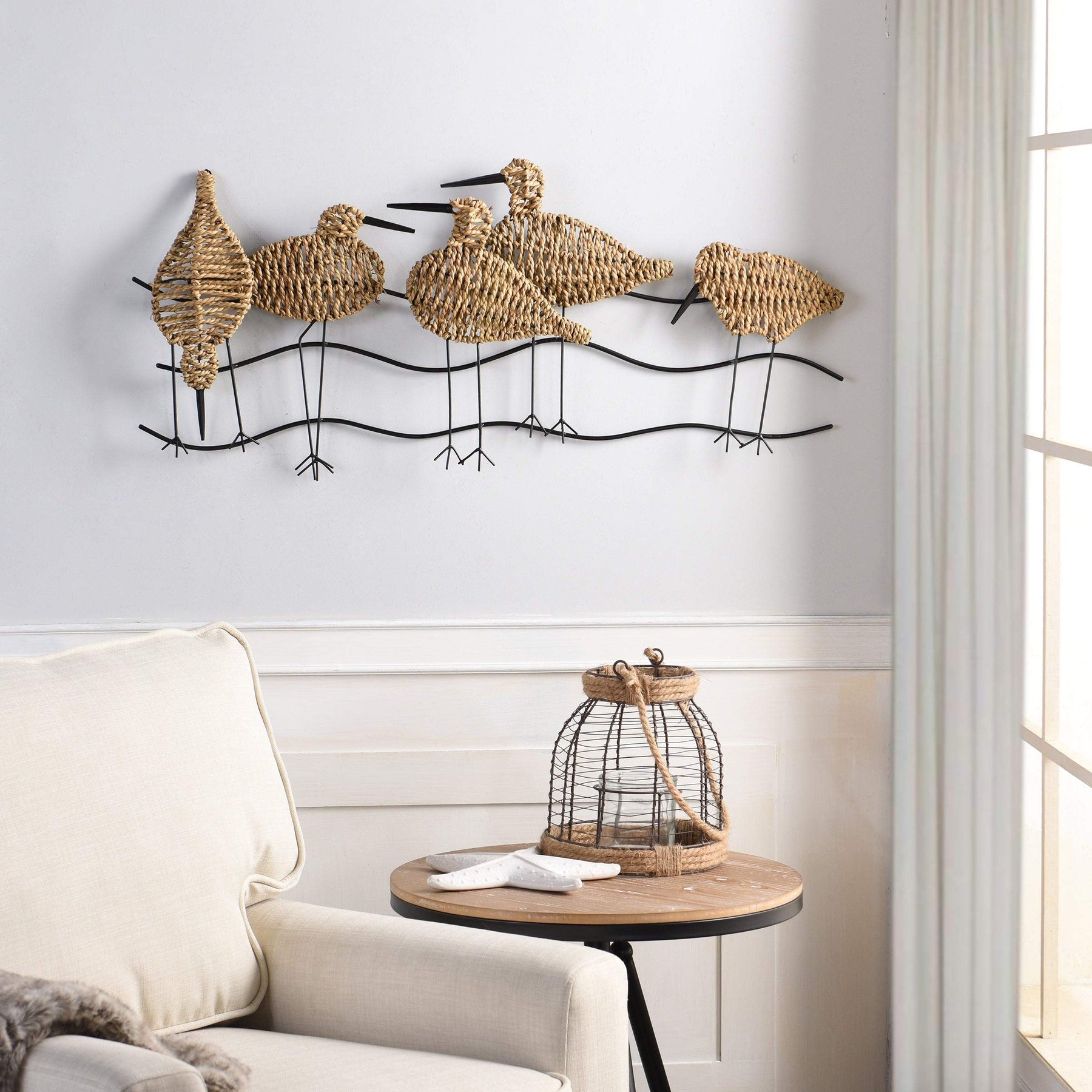 Flock Of Birds Natural Woven Seagrass Wall Art Silver Transitional Metal | Metal wall art with seagrass weaving. Wall art finish: Natural Woven Seagrass, Silver Metal. Wall art material: Woven Seagrass, Iron Metal. Frame type: Frameless. Install orientation: Horizontal. Product Size: 4.75 In. L X 36.25 In. W X 17.0 In. H. Design/Look : Transitional. Material : Metal. Accent type : Wall Decor | Product Size: 17 inches high x 36.25 inches wide x 4.75 inches deep.