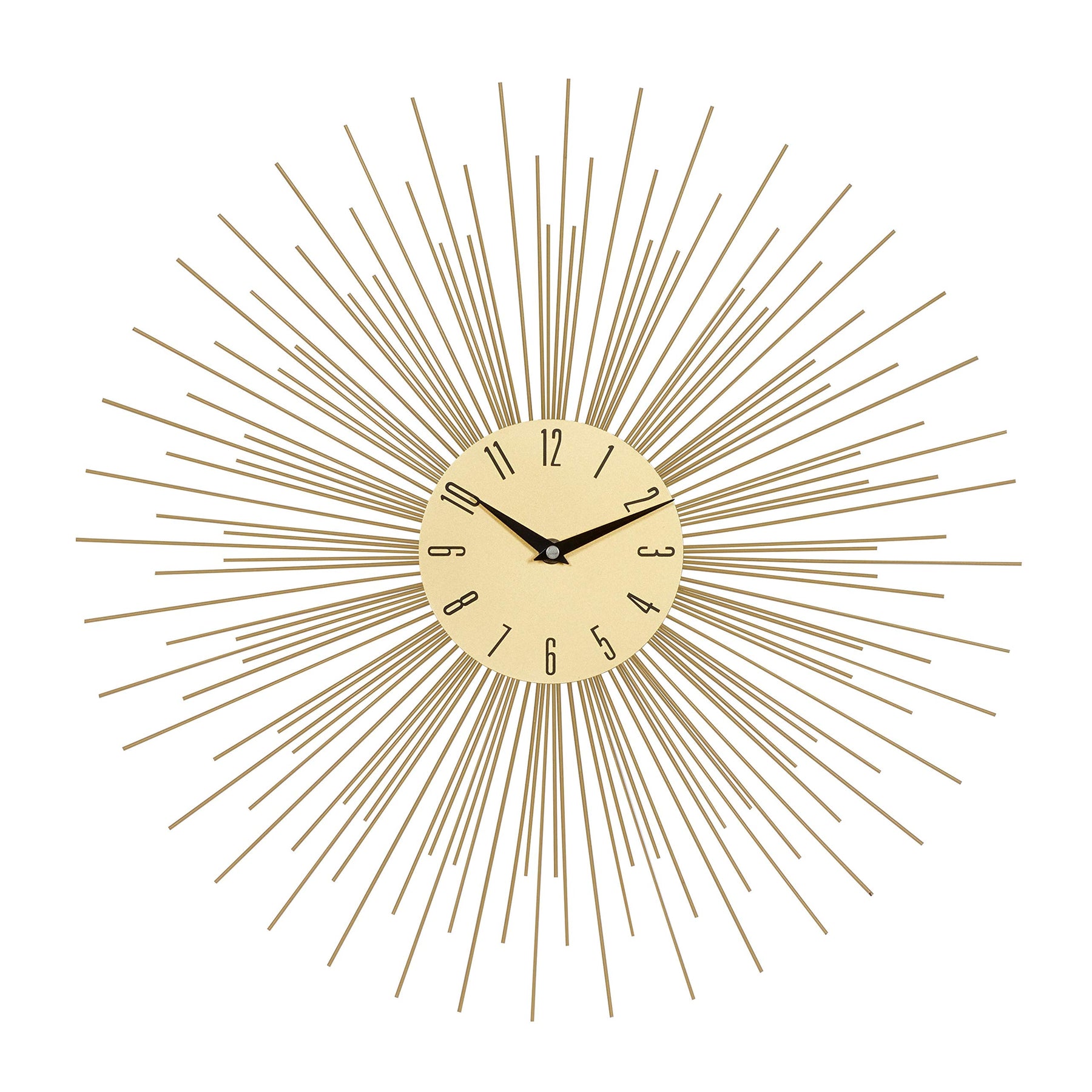 Gold Metal Contemporary Wall Clock 19 X 1 Yellow Modern | Ideal decor that works best in contemporary themed homes. Made from 100% metal. Polished silver clock face, black hour and minute hands, gold sunburst rays. Features a small clock face with oversized hour and minute hands. Design/Look : Modern & Contemporary. Material : Metal. Type : Analog | Measures: 19" x 19" x 1".