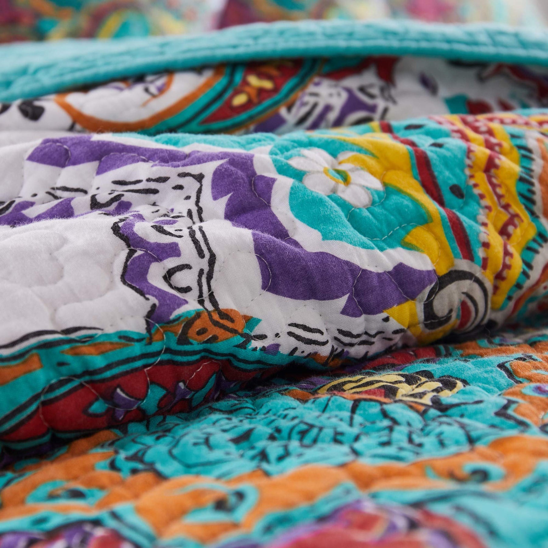A sumptuous display of powerful paisleys, this quilt set combines vibrant colors in an enchanting motif. Reverses to coordinating solid turquoise for a calming, sophisticated look. Oversized for better coverage on today's deeper mattresses. Prewashed and preshrunk 100% cotton face and back with 100% cotton fill. Machine quilted with fabric bound edges for durability and surface interest. Quilt set comes with quilt and two pillow shams (one sham per twin set). Dimensions: twin set includes one 68x88" quilt plus one 20x26" pillow sham, full/queen set includes one 90x90" quilt plus two 20x26" pillow shams, king set includes one 105x95" quilt plus two 20x36" pillow shams. Machine washable.