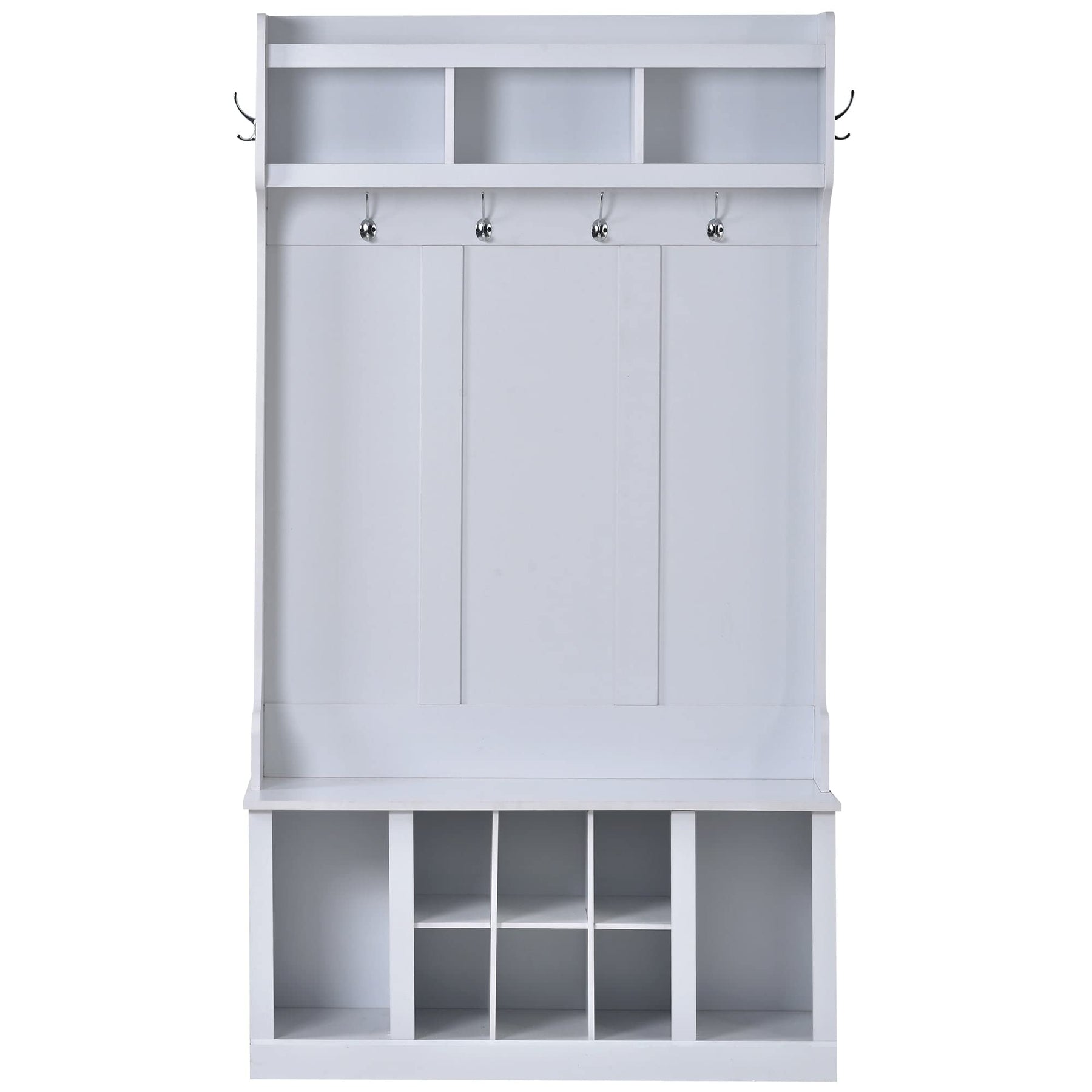 Hall Tree With 6 Hooks White Solid Wood | Multi-functional design for coat rack, shoe cabinet, storage, and porch tree. Durable construction with high-quality MDF. Easy installation with included accessories and detailed instructions. Equipped with a sturdy anti-dumping device for safety. Hardware packs and instruction manual included for easy installation. Material : Wood. Pattern : Solid. Bench type : Hall Tree. Frame material : Wood. Assembly : Assembly Required. Color : White. Storage type : Shoe Storage | Product Size: 39.4 In. L X 15.7 In. W X 70.8 In. H.