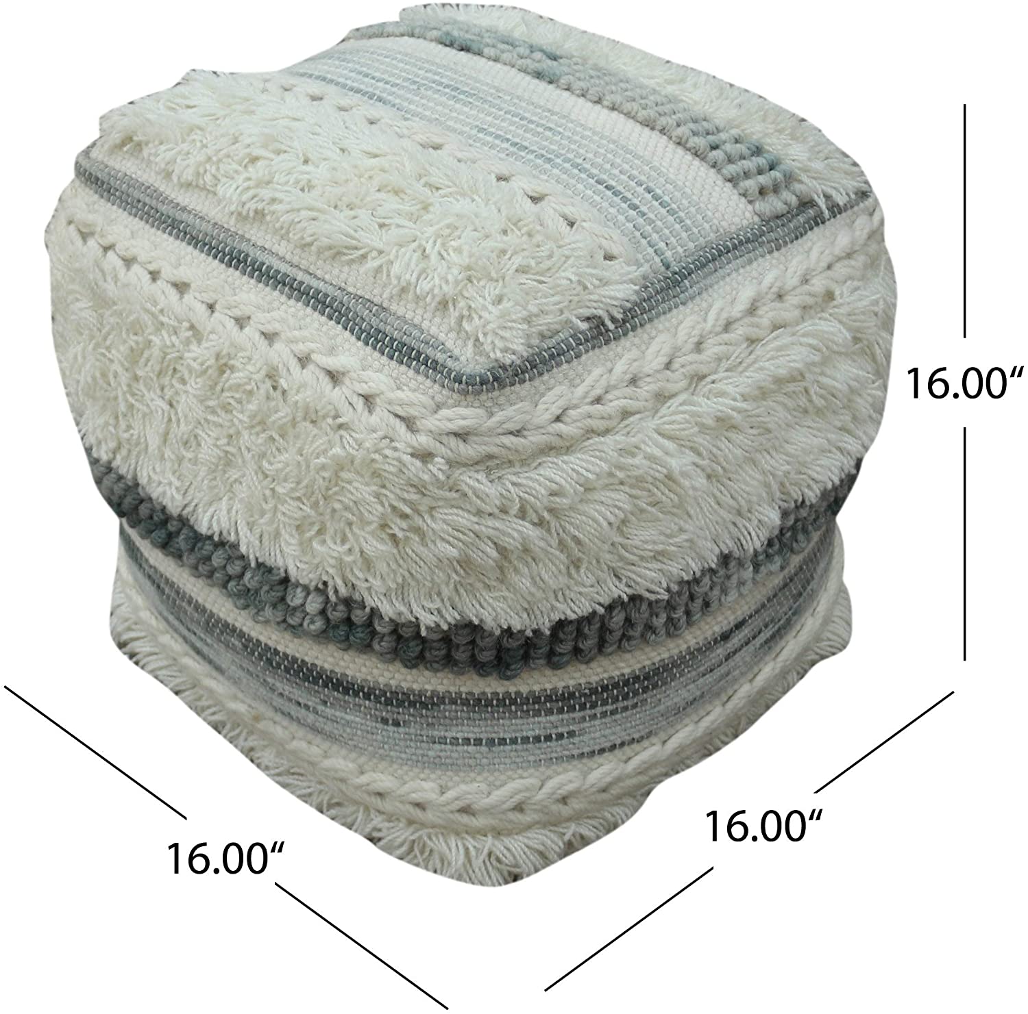 • Includes: One (1) Pouf. Material Info: Fabric. Color: Ivory and Gray. Hand-Crafted Details. No Assembly Required. Style : Bohemian & Eclectic, Farmhouse, Modern & Contemporary. Material : Wool. Type : Pouf. Print : Solid. Assembly : Assembled