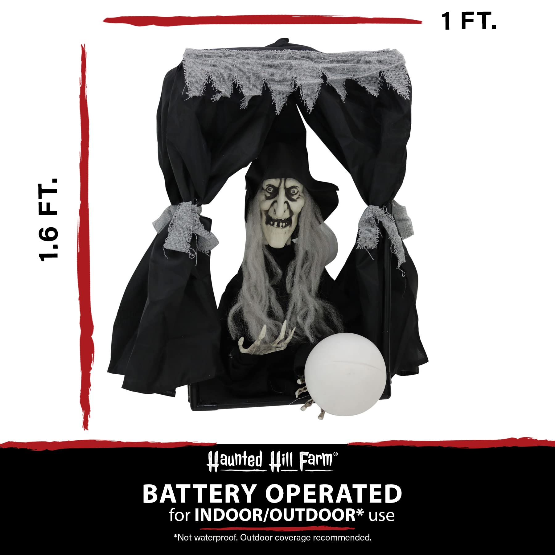 BE AFRAID. BE VERY AFRAID OF HAUNTED HILL’s Haunted Curses and Cauldrons Invite Orphelia the Witch to your home for the most cursed Halloween yet. She wants to see your future I wouldn’t get too close if I were you. Her arms and head sway beneath her dark witch costume, warning visitors of her unsettling powers. But be warned, your home might just be the most horrifying on the block. | ANIMATRONIC PROP: This 1.6 ft. hanging animated witch is perfect for your indoor or (covered) outdoor decor. Display your animated decoration in a variety of different scary and evil ways at your next party. | MULTI-FUNCTION DECOR: The cackling hag’s eyes flash red as she beckons visitors near. She wants to see your future I wouldn’t get too close if I were you. Backed by stormy sounds and ominous music, her predictions and disturb advice are sure to startle even the boldest of trick-or-treaters. | TOUCH ACTIVATED: Orphelia’s eyes flash red, arms and head sway, plays thunder sounds and ominous music. | SPEAKS: Phrase 1: "Come closer so that I may see your future”, Phrase 2: "My advice to you is, if you’re too open minded, your brains may fall out!”, Phrase 3: "I sense someone wishes advice, no, you are too close to me-step back a bit. Ah, now I can see you. Always remember, a conscience is what hurts when all your other parts feel so good!”, Phrase 4: "You’ve come for my wisdom. I have but one recommendation for you, eat well and stay fit-you’ll die anyway, but at least you’ll look better!”