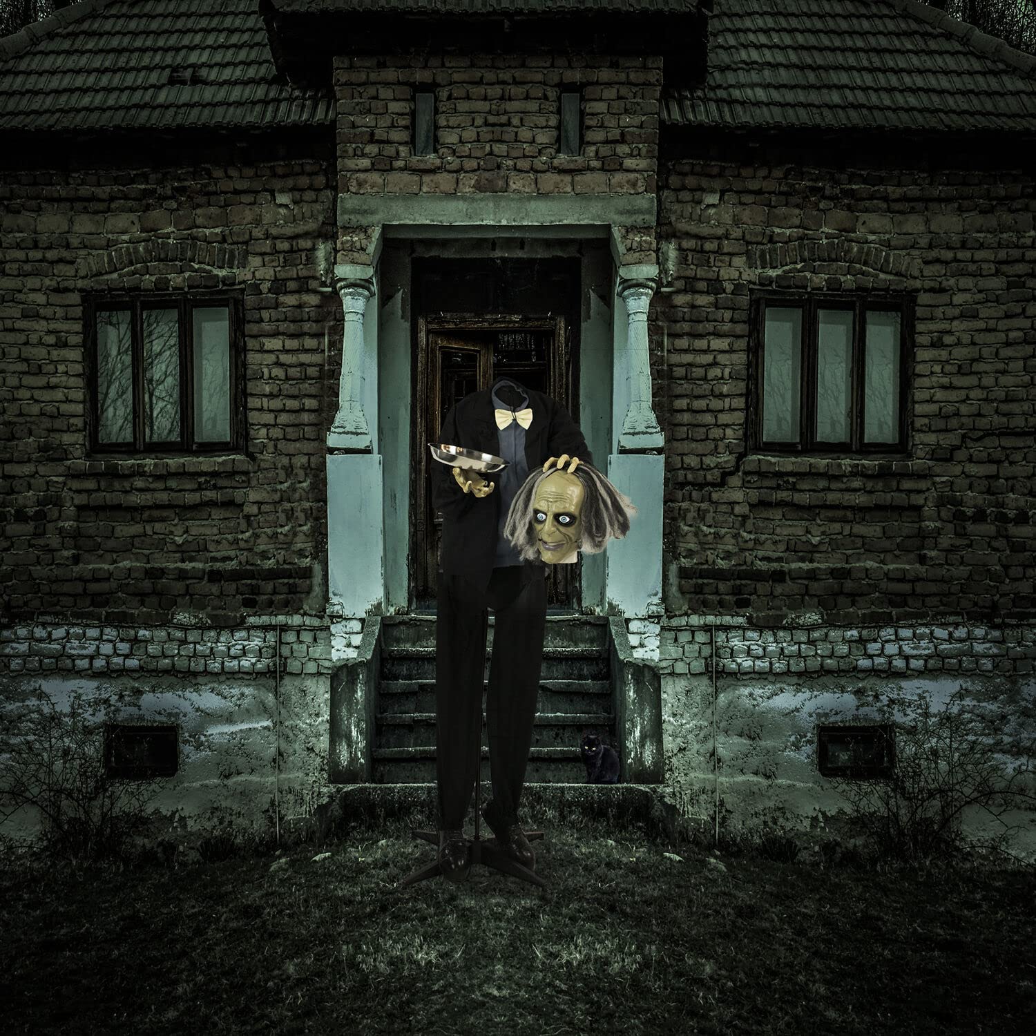 Haunted Hill Farm Life-Size Talking Headless Zombie Butler Holding Tray