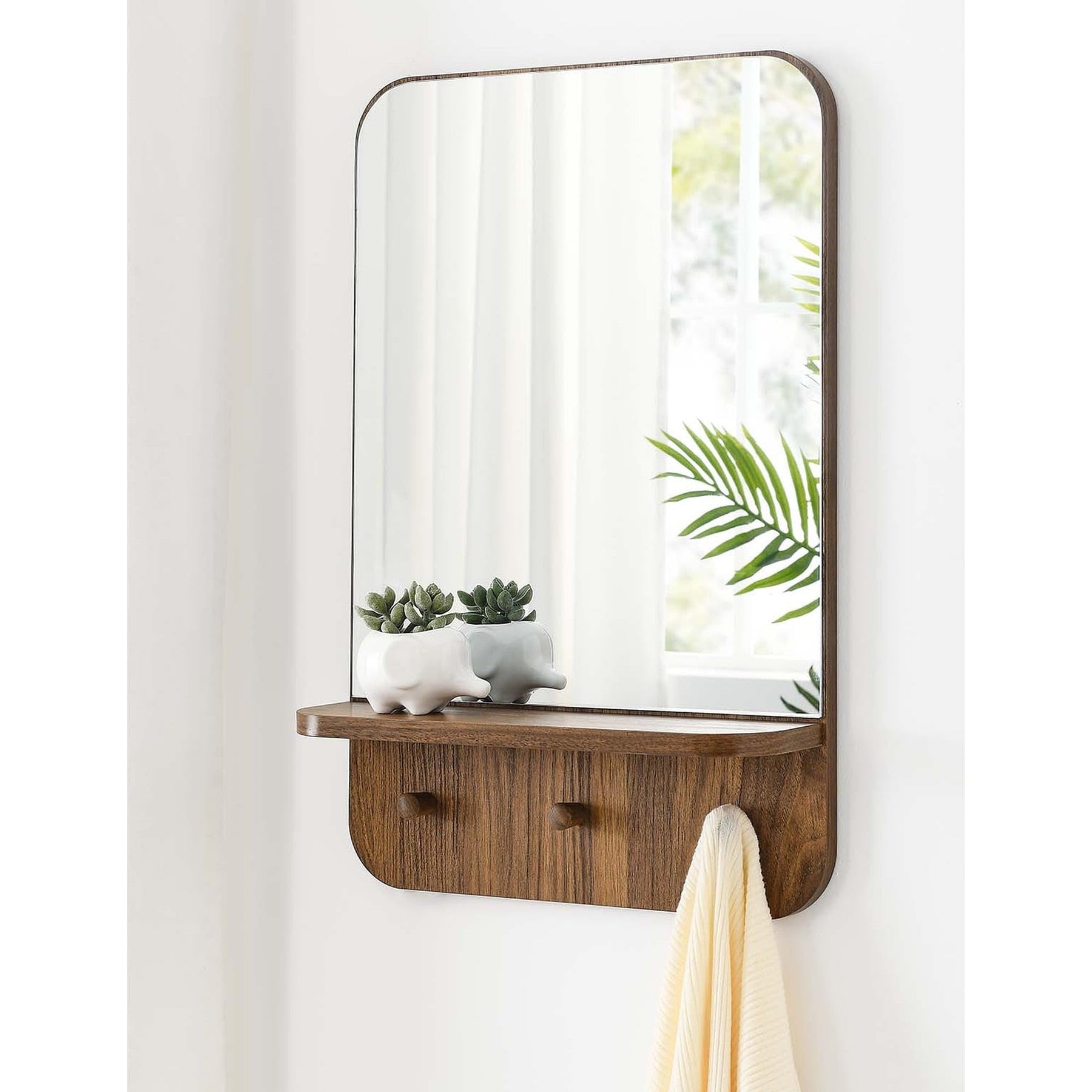 Hollow Modern Walnut Wall Mirror with Shelf and Hooks Brown