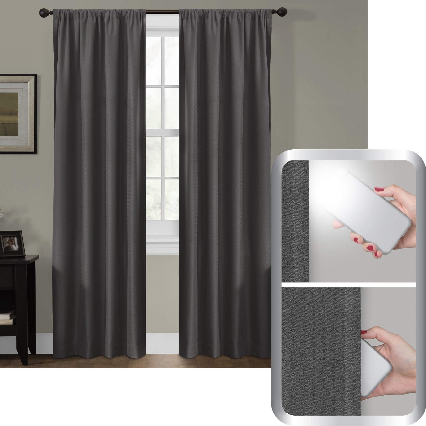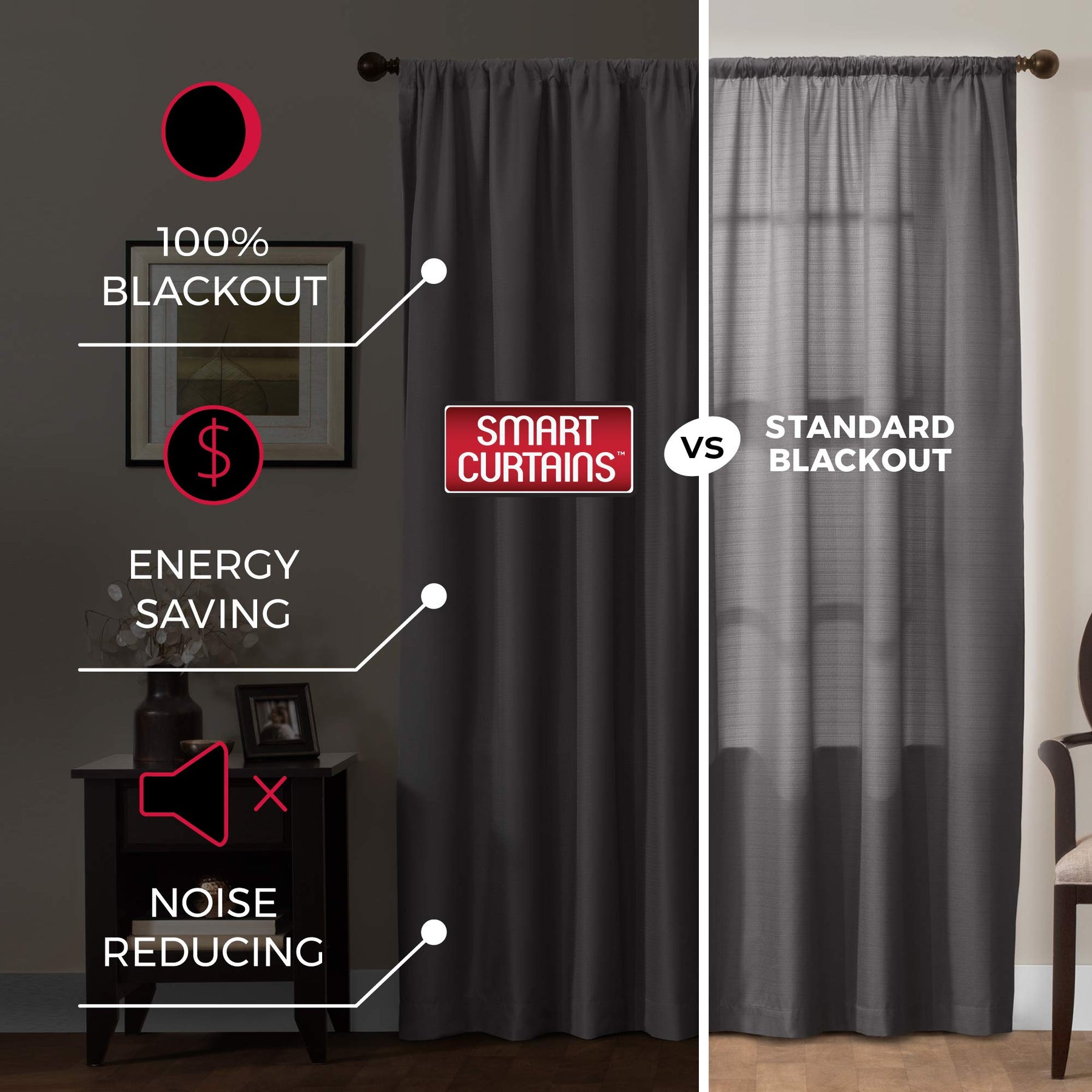 The Smart Curtains Ultimate Light Blocker window panel is certified to block 100 percent of light*.Save on energy costs and reduce noise. Features a jacquard geometric pattern.Rod pocket construction. 1 panel per package - we recommend using 2 panels for standard size window opening.Machine washable for easy care.*Claim based upon independent testing of smart curtains versus the standard blackout curtain.