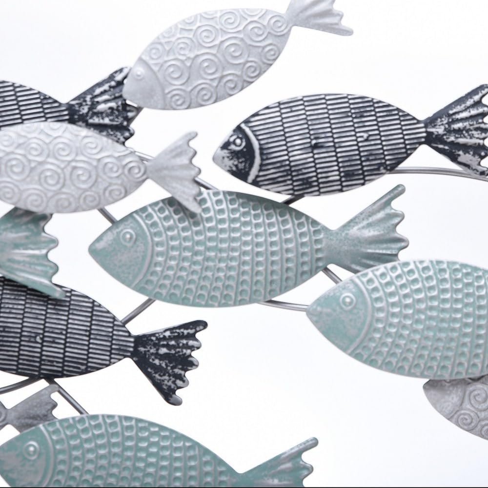 Collection: Metal School, Material: Metal, Finish Color: Multi-Color, Width: 56", Height: 20", Desc: Like a group of shimmering fish just below the surface of the sea, Metal School features multicolored metal circles traveling in a fluid pack. The asymmetrical formation of the piece creates a natural motif, while the individual detailing heightens the artistic aesthetic. Mounting in any direction, this metal wall art can blend with and enhance a living or dining room wall. With this metal wall decor design, this piece can be hung in multiple directions to fit any wall Due to the way this piece is made, no two are exactly alike and color finishes may vary from piece to piece. Hallway/Foyer/Living Room/Dining Room/Kitchen/Bedroom/Office / Mounting Direction: Horizontal. ,