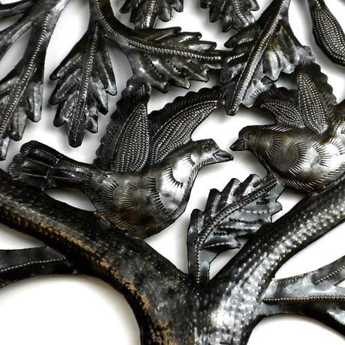 Metal Tree of Life Decor Lovers Heart Hanging Spiritual Art Inspirational Handmade Haiti Oil Drums Round Bohemian Birds Branches Grey 24 Inch