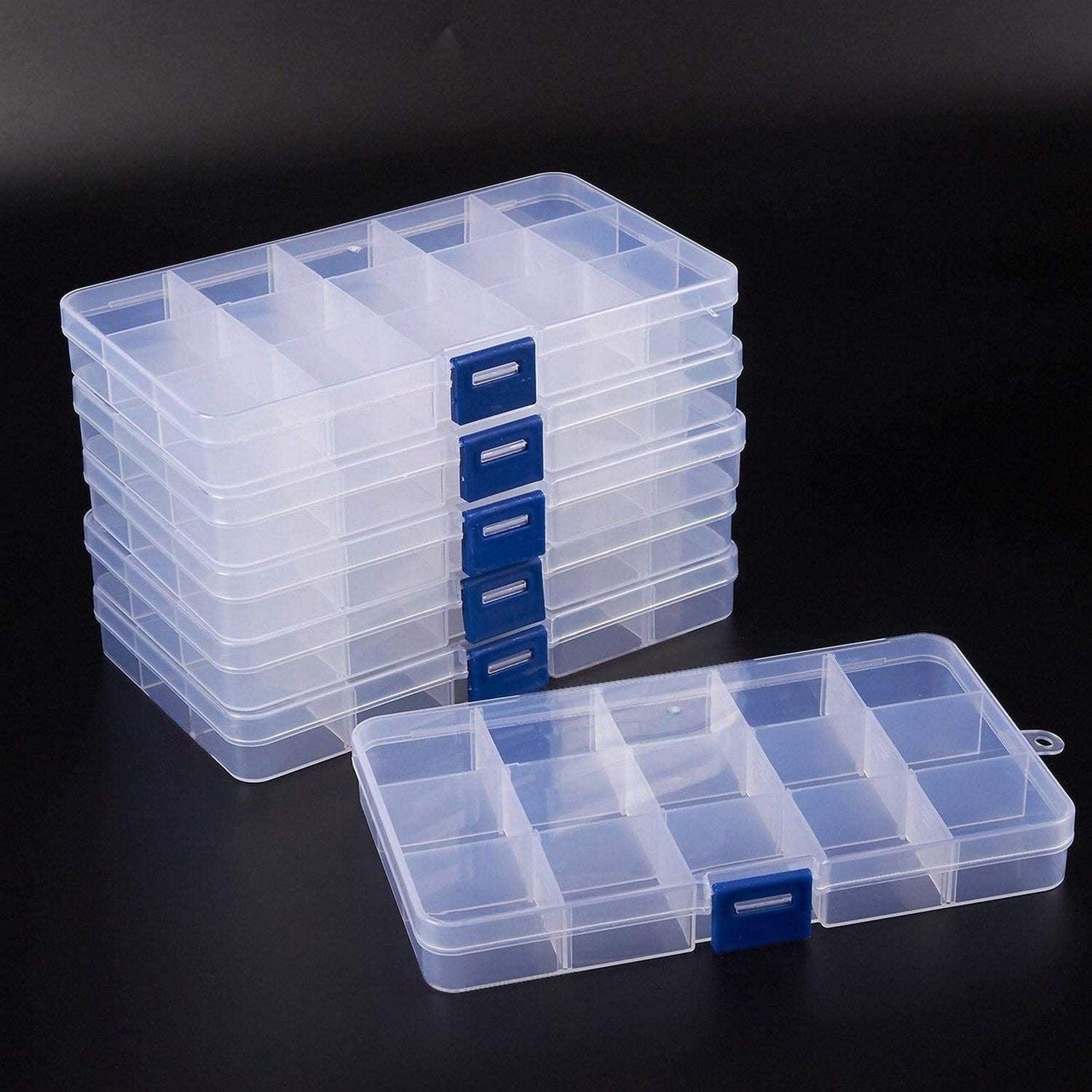 • Clear Jewelry Box - 6-Pack Plastic Bead Storage Container, Earrings Storage Organizer with Adjustable Dividers, 15 Compartments Each, 6.7 x 0.8 x 4 Inches. Product SIze: Each of the 6 boxes measures 6.7 x 0.8 x 4 inches. Dimensions : 12.28 In. X 7.6 In. X 3.5 In.