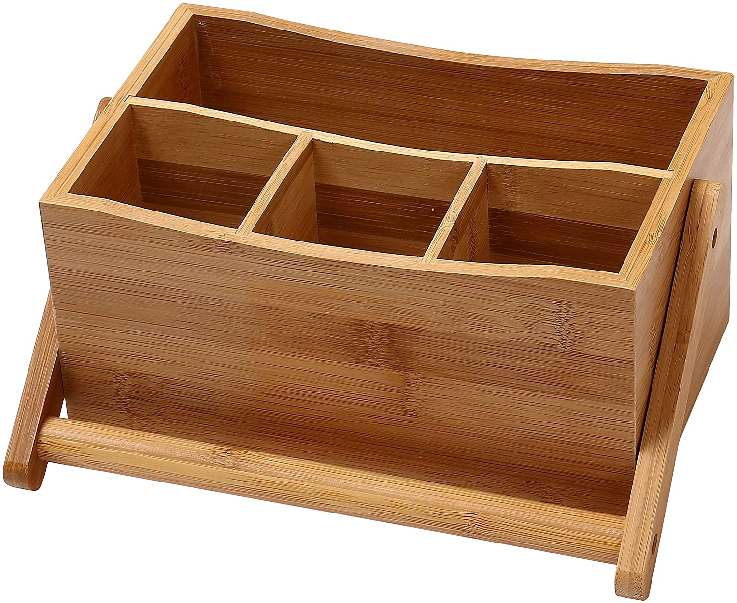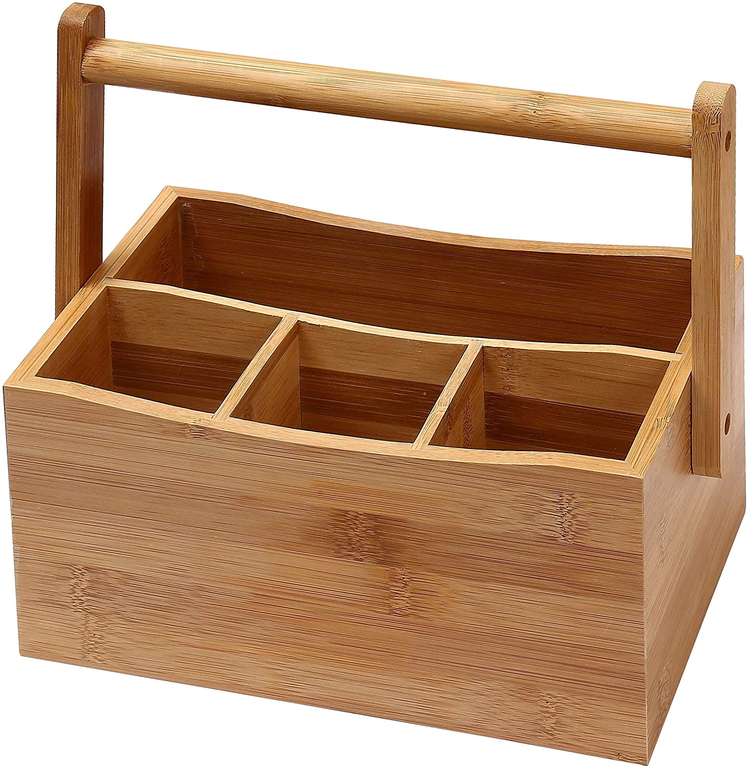 Home 4 Compartment Bamboo Cutlery Napkin Caddy Handle Wood