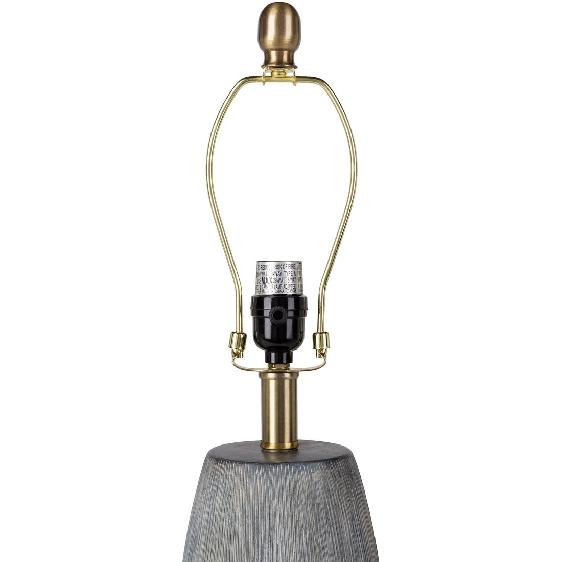 Shade material : LinenNumber of bulbs: 1Design/Look : Modern & ContemporaryMetal FinialGray Glazed Ceramic BodyLamp height : 21 to 24 InchesExact bulb wattage : 100Base material : CeramicBase shape : CylinderCord Length: 6'Shade shape : DrumUL CUL CertifiedE-26/100 WColor : Grey, WhiteColor temperature : Soft White 3000K - 4000KMade in China Light bulb type : IncandescentSwitch type : 3-wayLight direction : Downlight, Multi-directional, UplightProduct Size : 12.0 In. L X 12.0 In. W X 23.5 In. HTable lamp type : StandardSwitch Type: 3-WayWhite Linen ShadeOverall Product Size: 24"H x 12"W x 12"DFinish enhancements : Antiqued