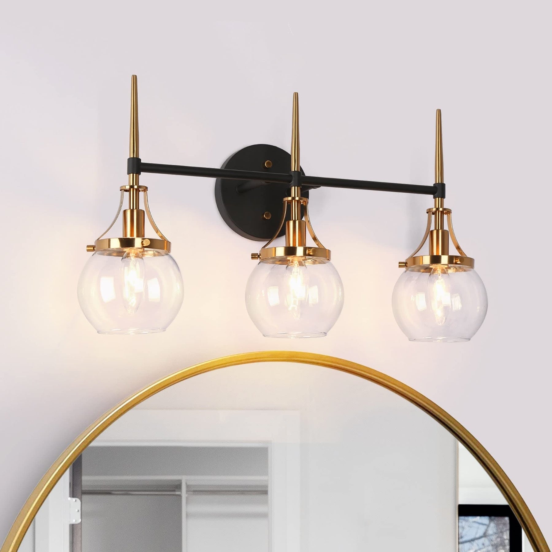 Modern Glam 3-light Glass Bathroom Vanity Lights Black Gold Wall Sconces Blackgold 21.7''l X 7''w 12.5''h Mid-century Contemporary Metal Dimmable | Design/Look : Glam, Mid-Century Modern, Modern & Contemporary. Material : Glass, Metal. Finish : Black. Shade material : Glass. Assembly : Assembly Required. Exact bulb wattage : 40. Finish enhancements : Painted. Fixture design : Globe, Linear. Glass type : Clear. Light bulb type : Incandescent, LED Compatible. Light direction : Multi-directional. Power source : Hardwired. Dimmable. Product Size: 21.7 In. L X 7.0 In. W X 12.5 In | Length : 13 to 24 Inches.