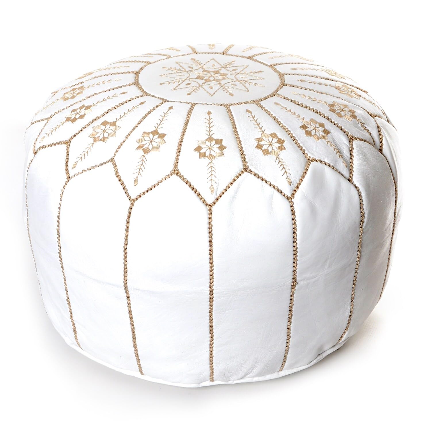 Moroccan Flower Leather Pouf Round White Embroidered Ottoman (Morocco)