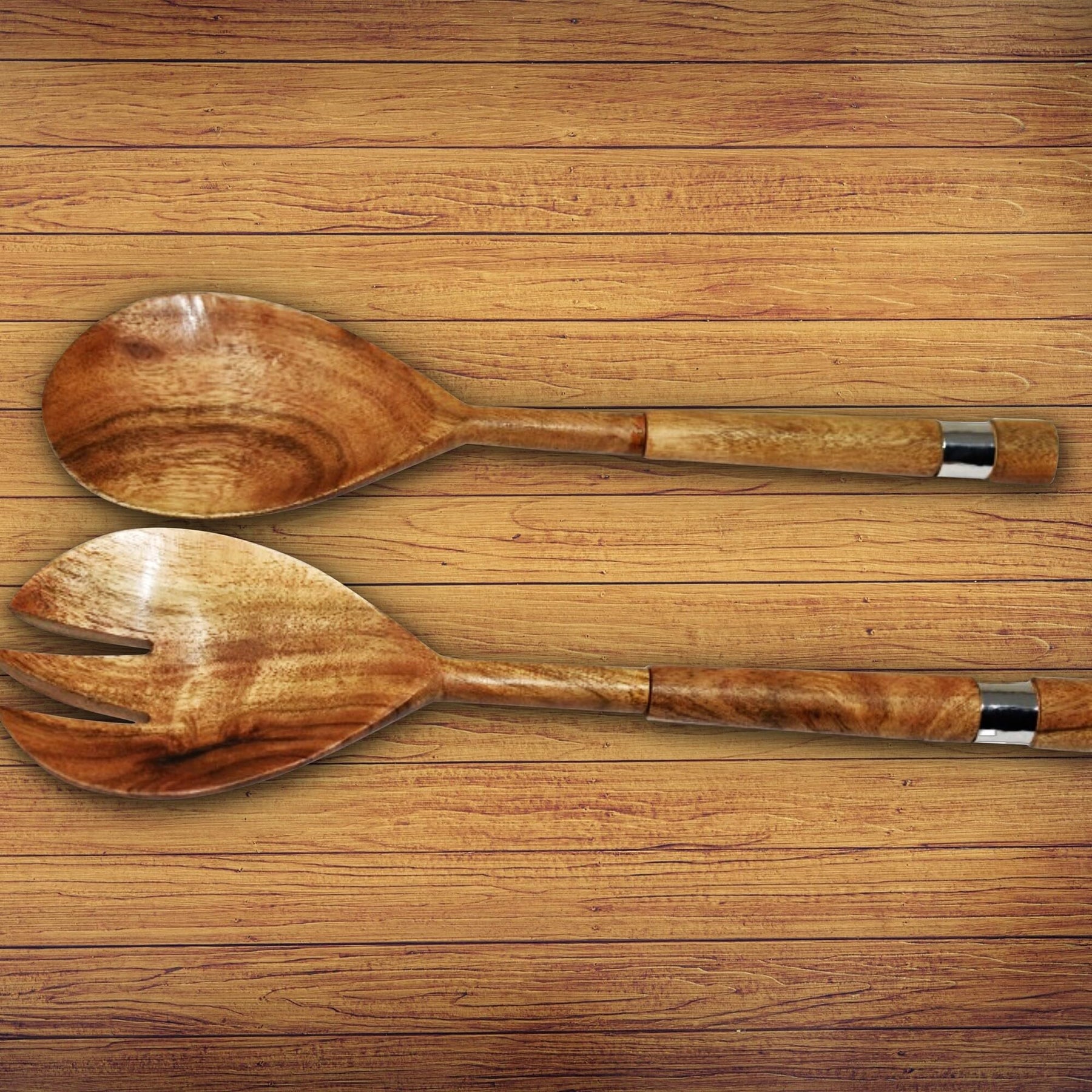 Natural Acacia Wood with Hammered Nickel 2 Pc Salad Server