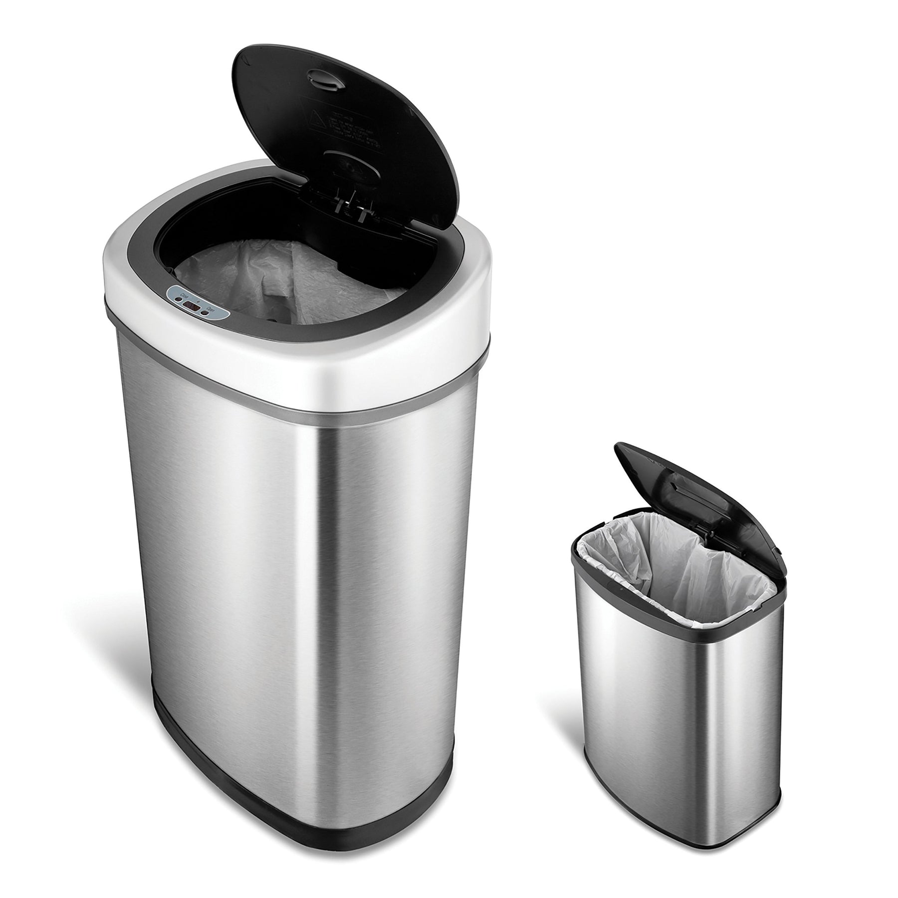 These 2-in-1 Stainless Steel are designed and engineered by nine stars The world's first legal patent holder. With one kitchen size and one bathroom size, you can use them almost any place you want, such as kitchen, office bathroom, dorm room or a kid's room. These two trashcan uses the most advance sensor technology can be found in all nine stars trashcans. As your hand or debris within ten inches and 130° angle from the infrared sensor, the lid will automatically opens. The lid will remain open if debris or hand remains within the range of the infrared sensor. Three seconds after your hand moves away from the lid, it closes automatically. Energy Saving technology keeps battery life 20Percent longer in normal daily usage. Required four D-size batteries for smaller can and three C-size or 4 D-size batteries for larger can (not included). includes an inner plastic bucket (dzt-8-1c) for easy cleaning. The size of the trashcans are 13 Gal. (50Liter) & 2 gal. (8Liter).