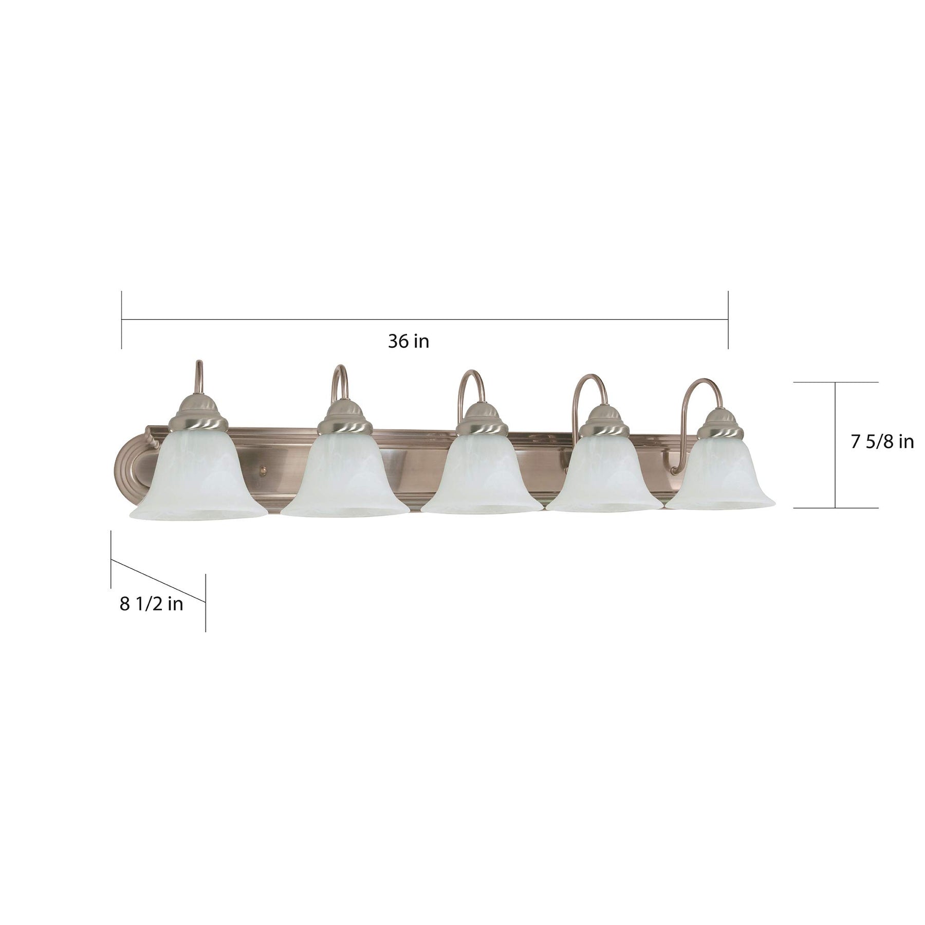 Product DescriptionNovo Lighting 60/323 Traditional Five Light Vanity from Ballerina collection in PW, Nickle, B/S, Slur. finish, Height: 7.63 inches Width: 36.00 inches Style: Traditional Light Type: Vanity & Wall Safety Rating: callus and Safety Listing: Damp Number of Lights: 5, Bulb Type: A19, Bulb(s) Included: NoFrom the ManufacturerBrushed nickel ballerina five light 36-Inch vanity with alabaster glass. (5) 100-Watt A19 medium base bulbs not included.