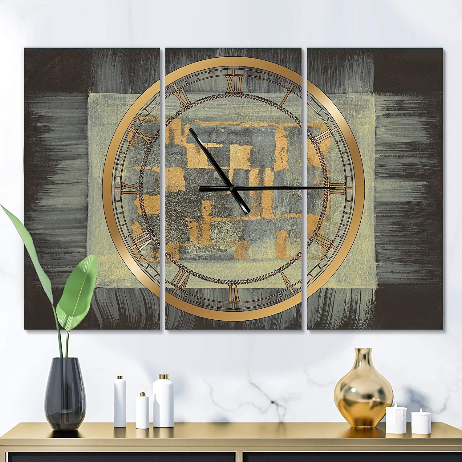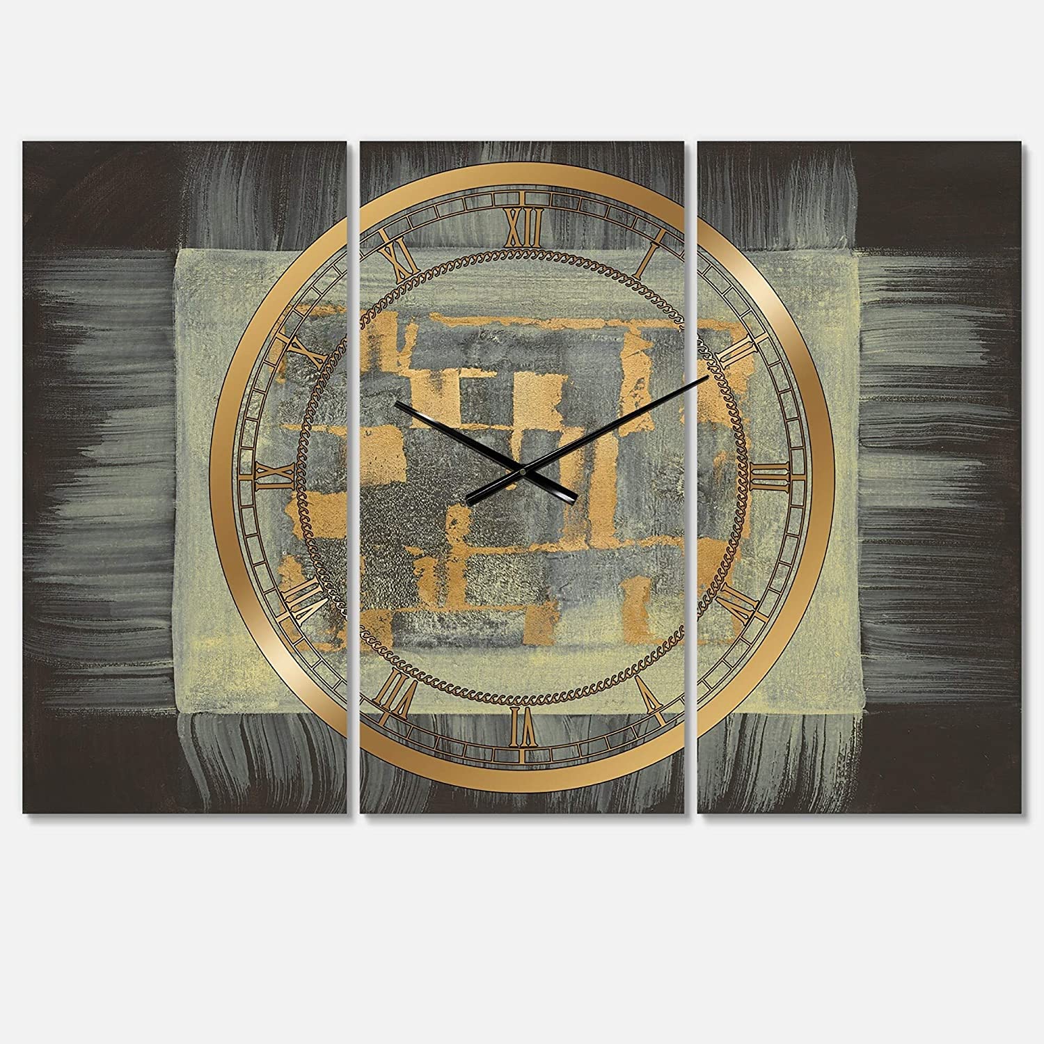 Gold Geometric Tapestry Ii' Glam 3 Panels Oversized Wall Clock
