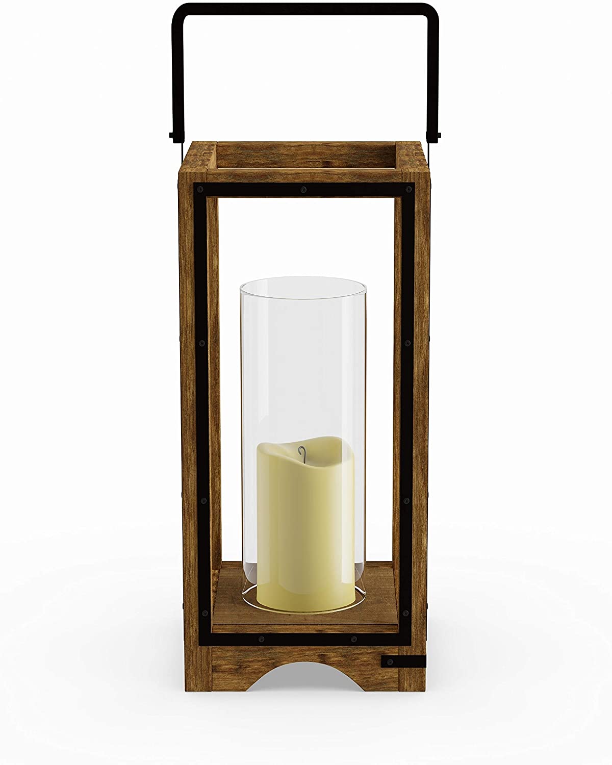 • Wood frame. Reinforced with iron. Glass votive shade. Rustic, industrial style. Distressed finish. Squared handle. Product Size: 22 inches high x 8 inches wide x 8 inches deep. Design/Look : Farmhouse. Material : Iron, Wood. Type : Lantern