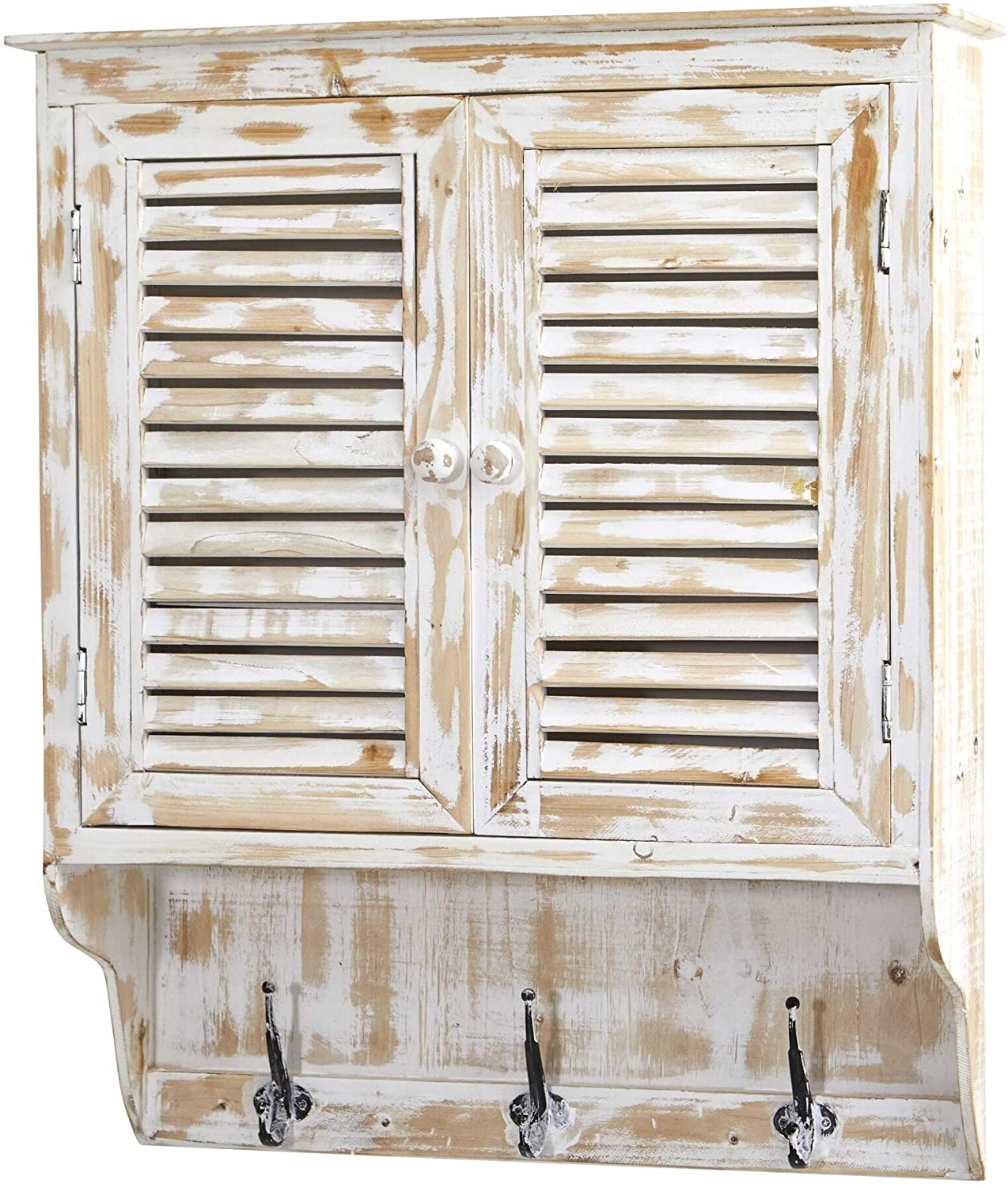 32" White Washed Wall Cabinet Hooks Beige Wood Finish Storage