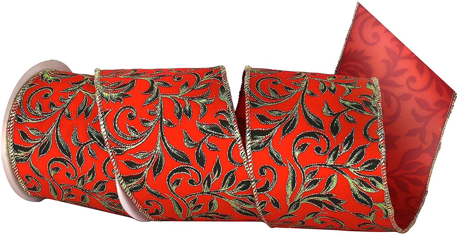 4" Printed Leaf Vine Velvet Ribbon Set 3 Red Polyester