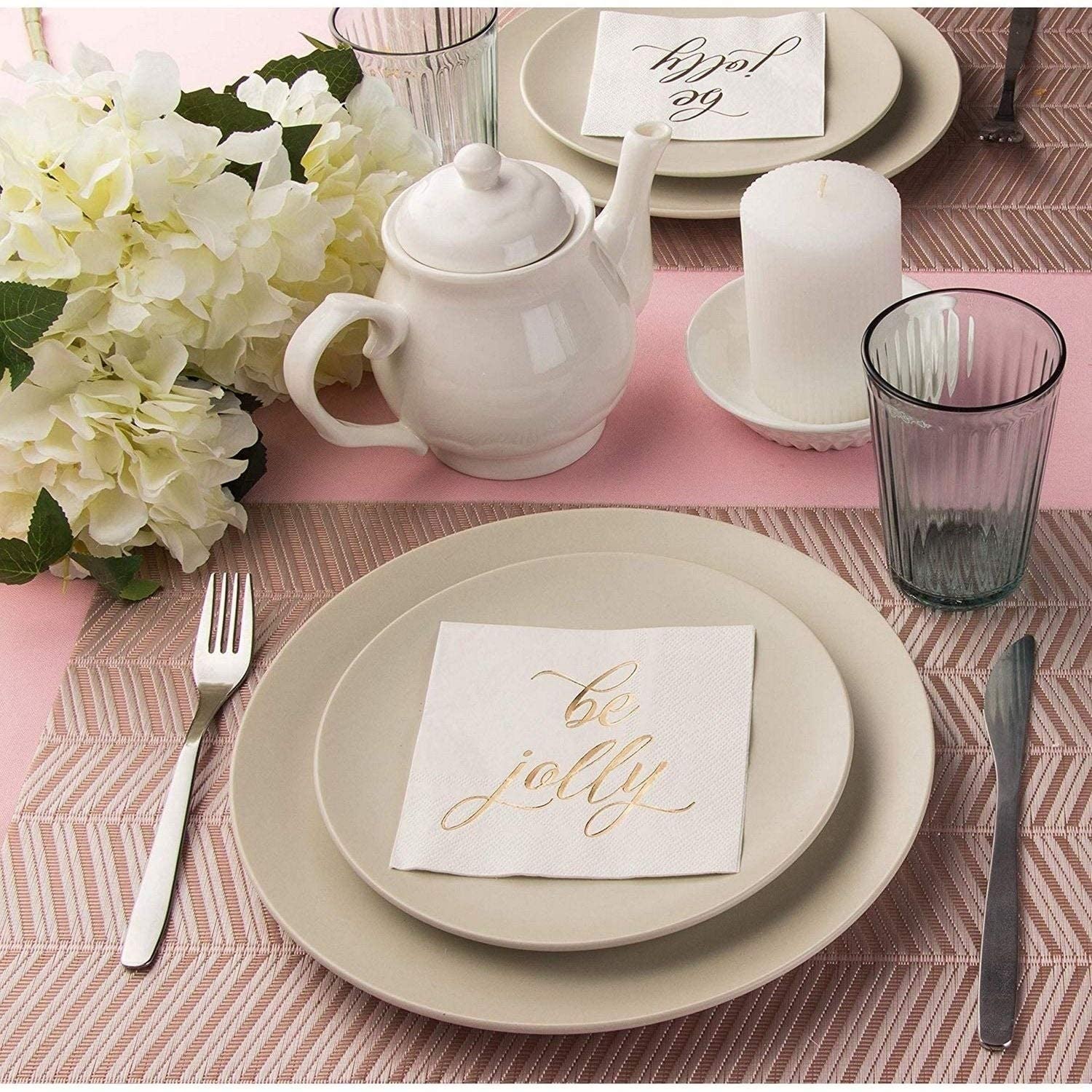 • 1 X Party Supply. FESTIVE SET INCLUDES: 102 highly absorbent 3-ply party napkins made from paper featuring "Happy Holidays" on green background, "Let Us Be Merry" on red background, and "Be Jolly" on white background. Adorable Christmas-inspired text in metallic gold foil stamped on colored napkins. THICK AND DURABLE: Each sheet is 3-ply to ensure that it doesn't tear easily when used; highly absorbent and soft to ensure a comfortable wiping experience. Product Size: 1.0 In. X 1.0 In. X 1.0 In