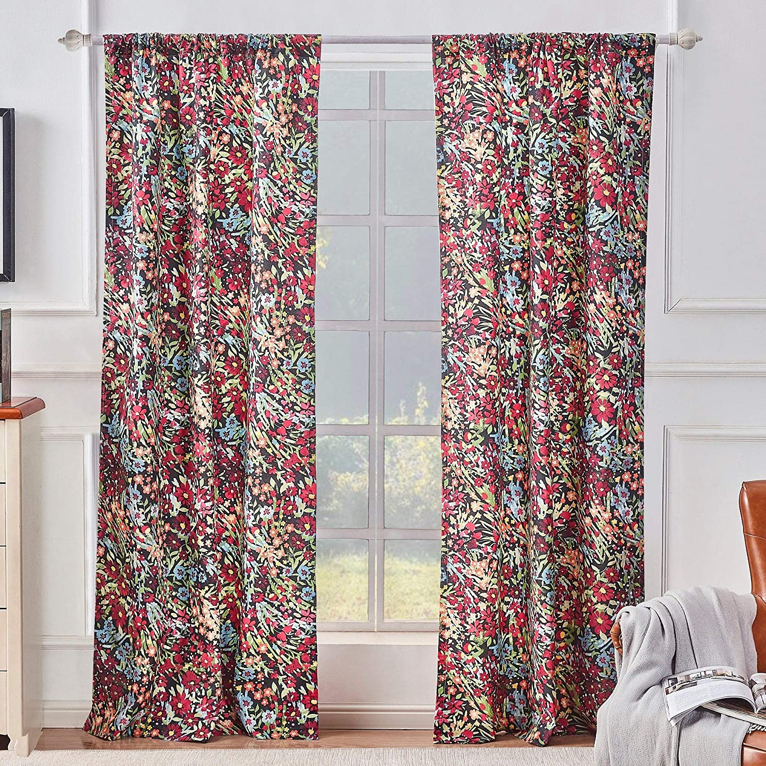 • Made of 100-percent polyester. Transitional Modern and Contemporary style. Floral print. Natural with brown, red and green art motifs. 3-inch rod pocket header. Lined for increased privacy and sun protection. Includes tie backs. Light filtering. Machine washable. Color : Black, Gold, Green. Design/Look : Bohemian & Eclectic, Modern & Contemporary, Transitional. Type : 2 Panel. Pattern : Floral. Length : 84 Inches. Material : Microfiber. Fabric care : Machine Wash