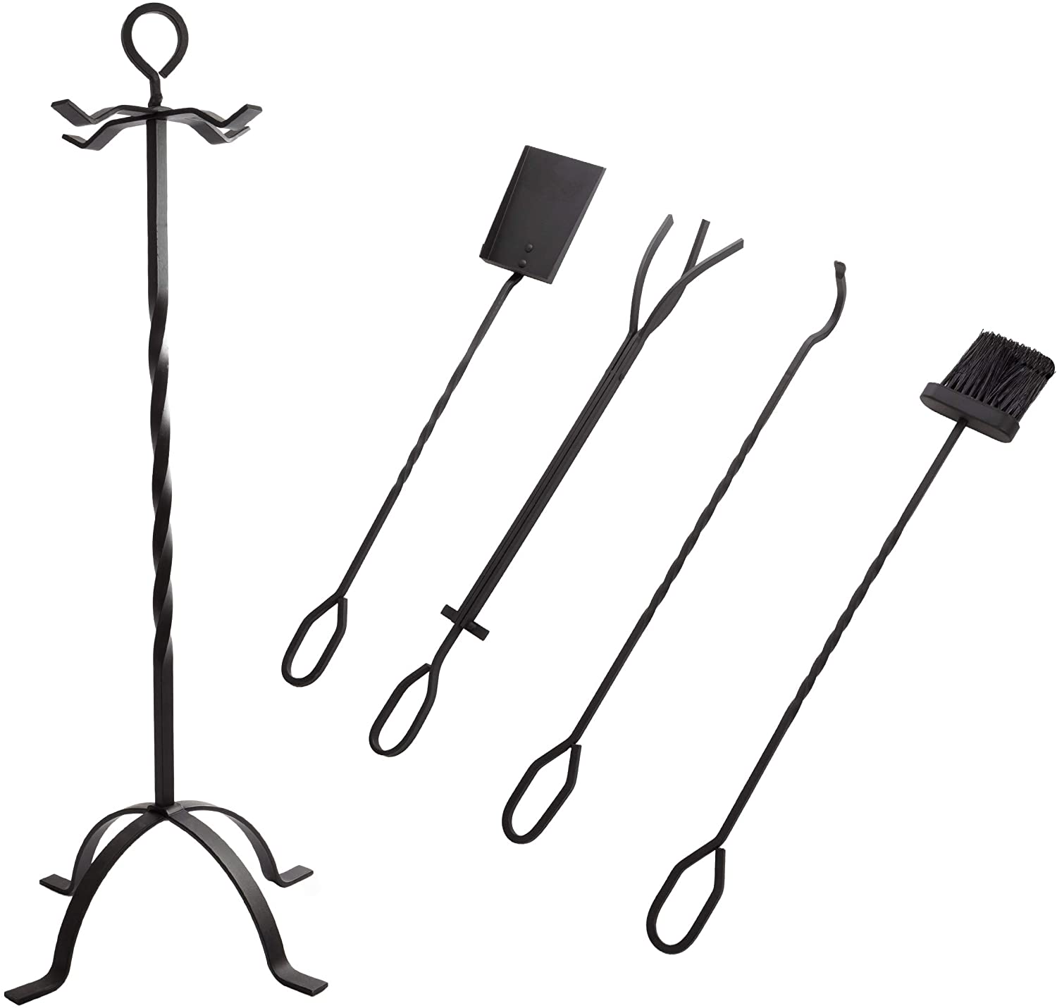 • Complete fireplace tool set with a storage stand. Includes 1 of each - broom, dustpan, tongs, and poker. Decorated with classictwistdetailing on the rods. Tool handles hang on the stand for compact storage. Durable construction that can handle extreme heat. Materials: Wrought Iron. Tool Product Size: Broom (L) 4 x (W) 1.25 x (H) 26-inches, Poker (L) 2 x (W) 3 x (H) 25-inches, Shovel (L) 4.25 x (W) 0.75 x (H) 27-inches, Tongs (L) 4 x (W) 2.25 x (H) 26-inches. Color: Matte Black