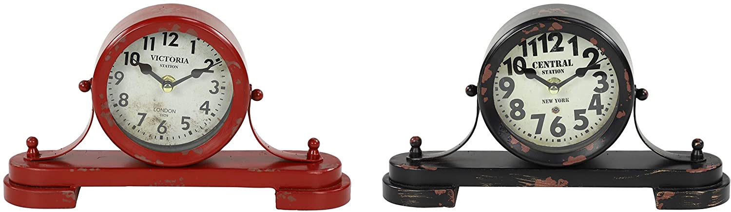 Large Vintage Distressed Red Black Round Metal Table Clocks Set 2 11" X 6" Each 11 3 6round Iron - Diamond Home USA
